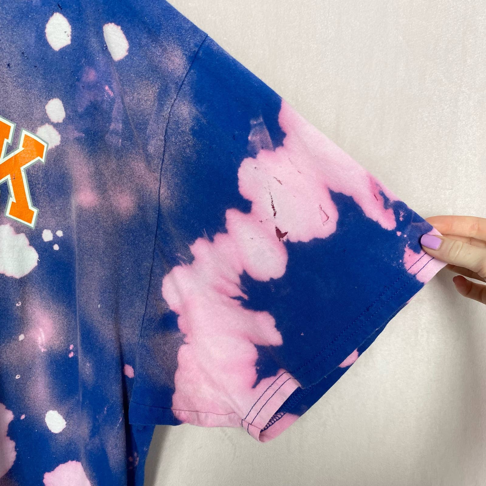 The Go To Tee Adidas NBA Knicks Porzingis 6 acid washed bleached ripped tie dye short sleeve blue pink basketball t-shirt. soft stretchy cotton fabric