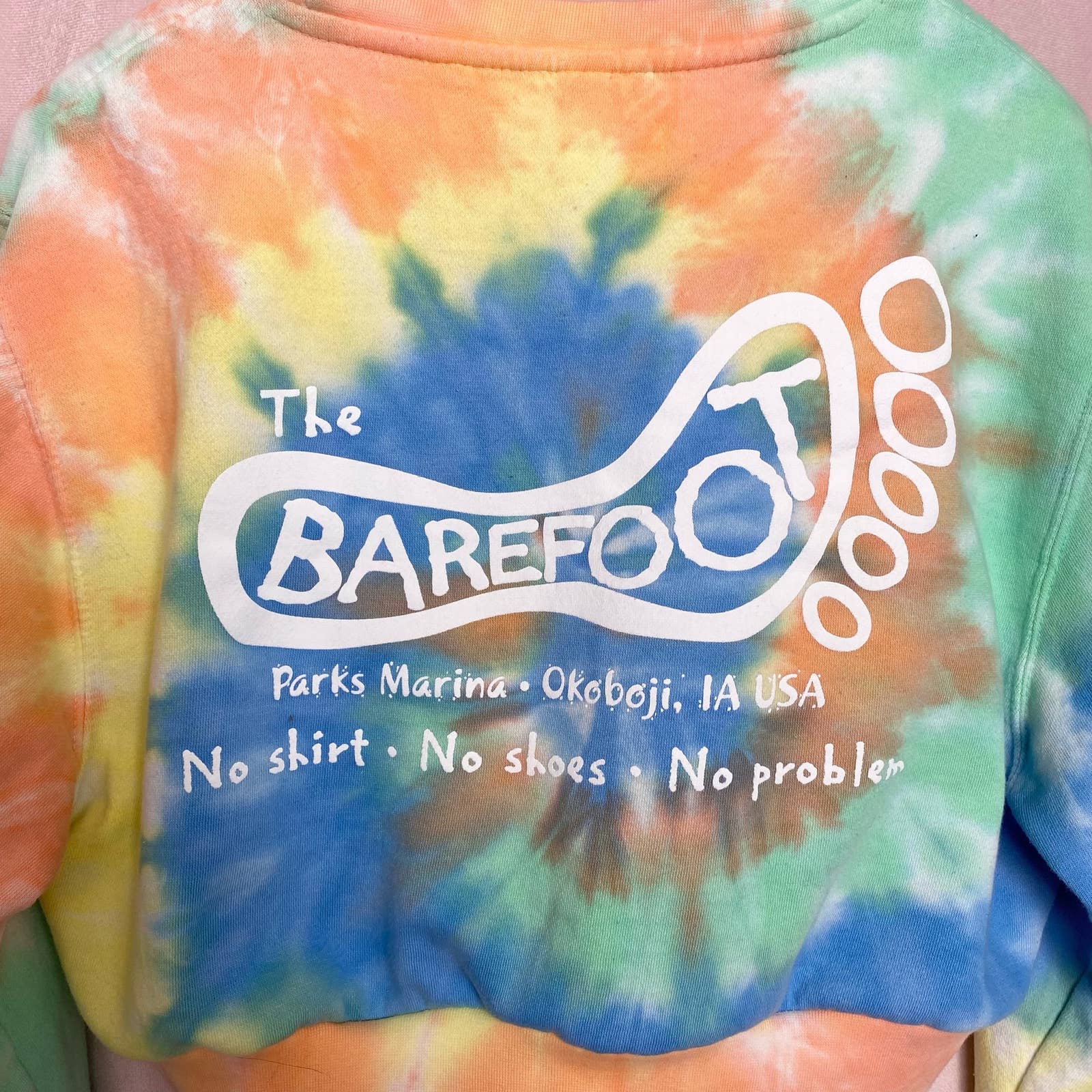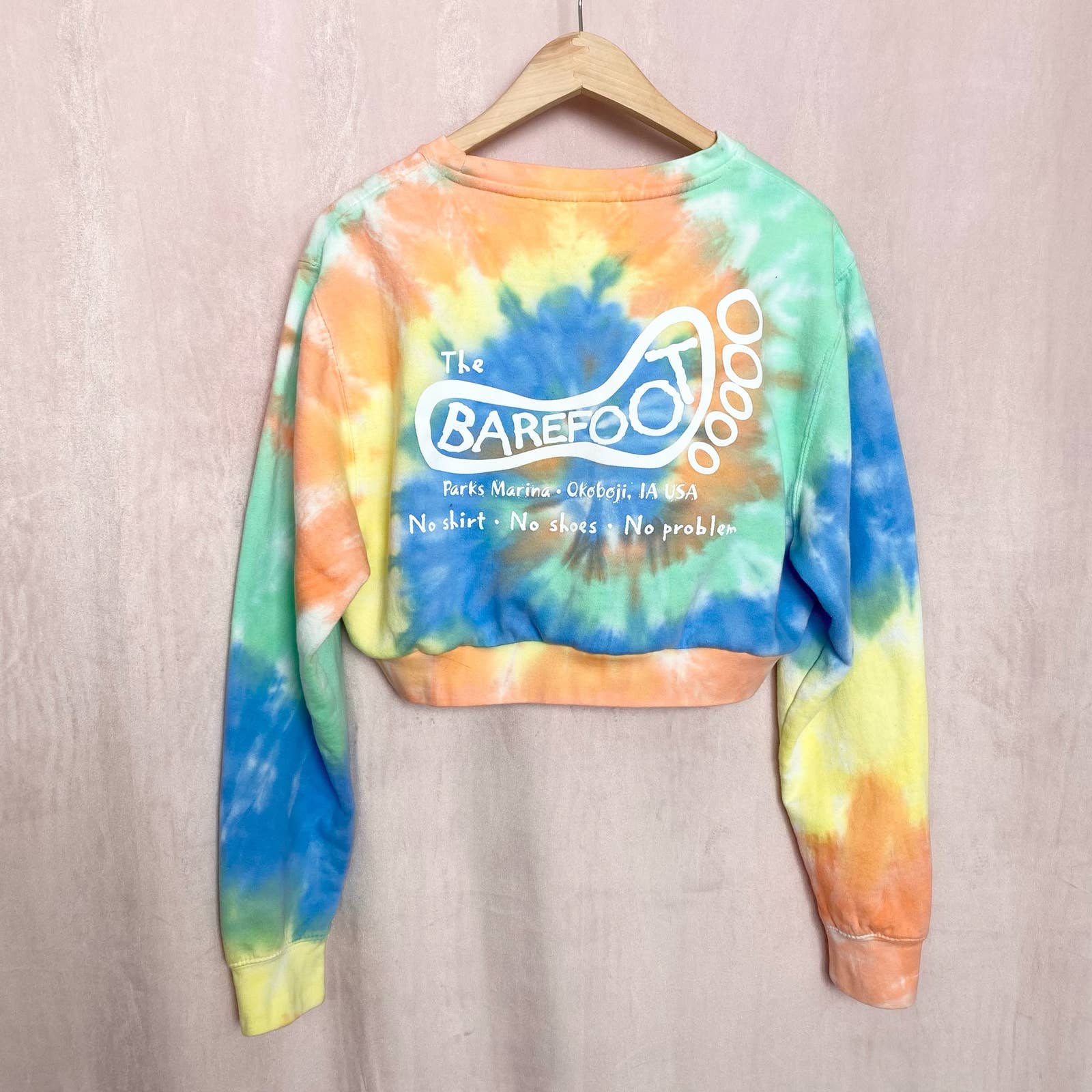 the barefoot bar at parks marina Okoboji Iowa multicolor cropped crewneck sweatshirt long sleeve. “no shirt no shoes no problem”. thick material. bright blue green orange yellow colors. size n/a but fits medium / large