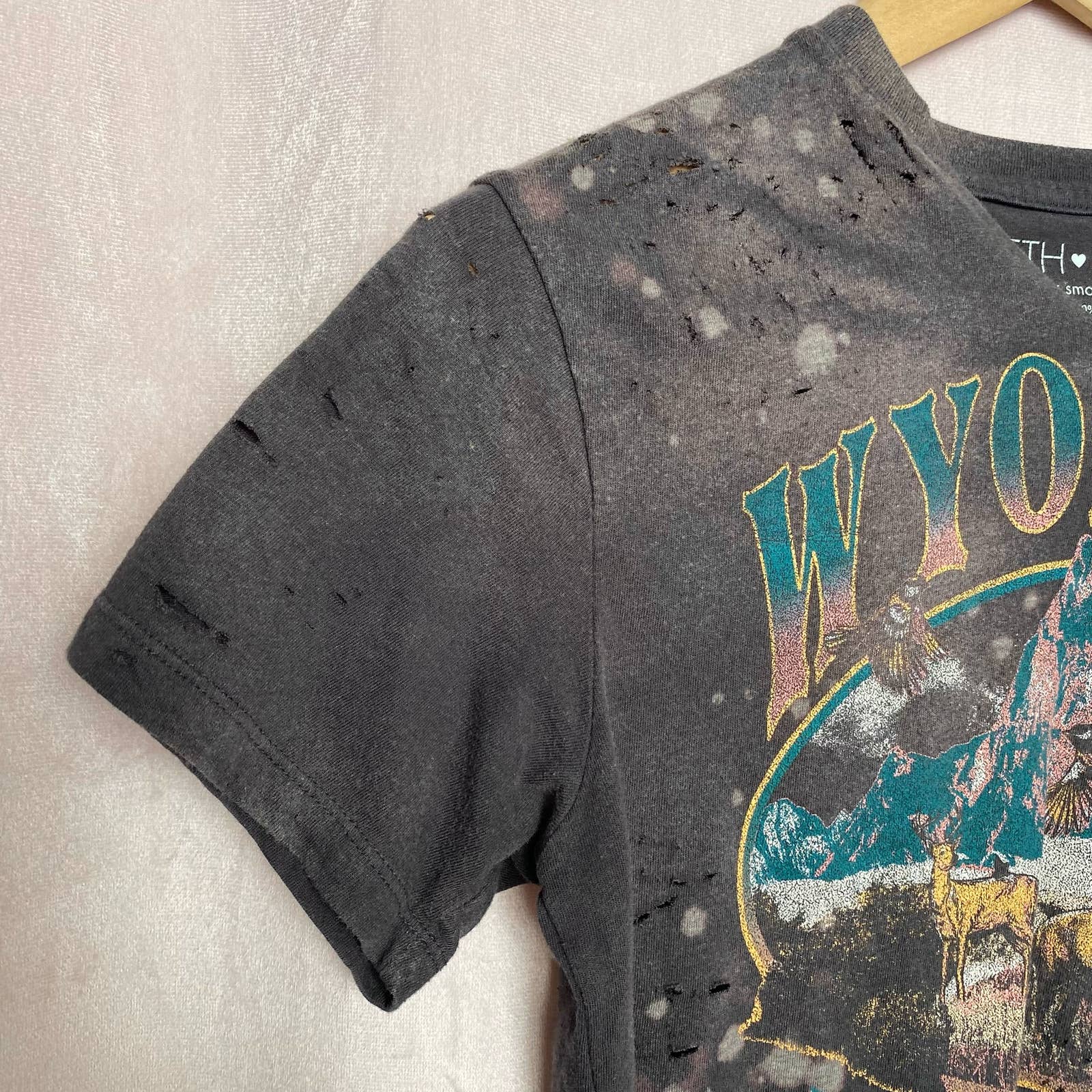 short sleeve acid washed ripped bleached cropped graphic “wyoming like no place on earth” t-shirt with dangly string fabric on sides. charcoal black/gray multicolor. lightweight soft stretchy cotton poly blend