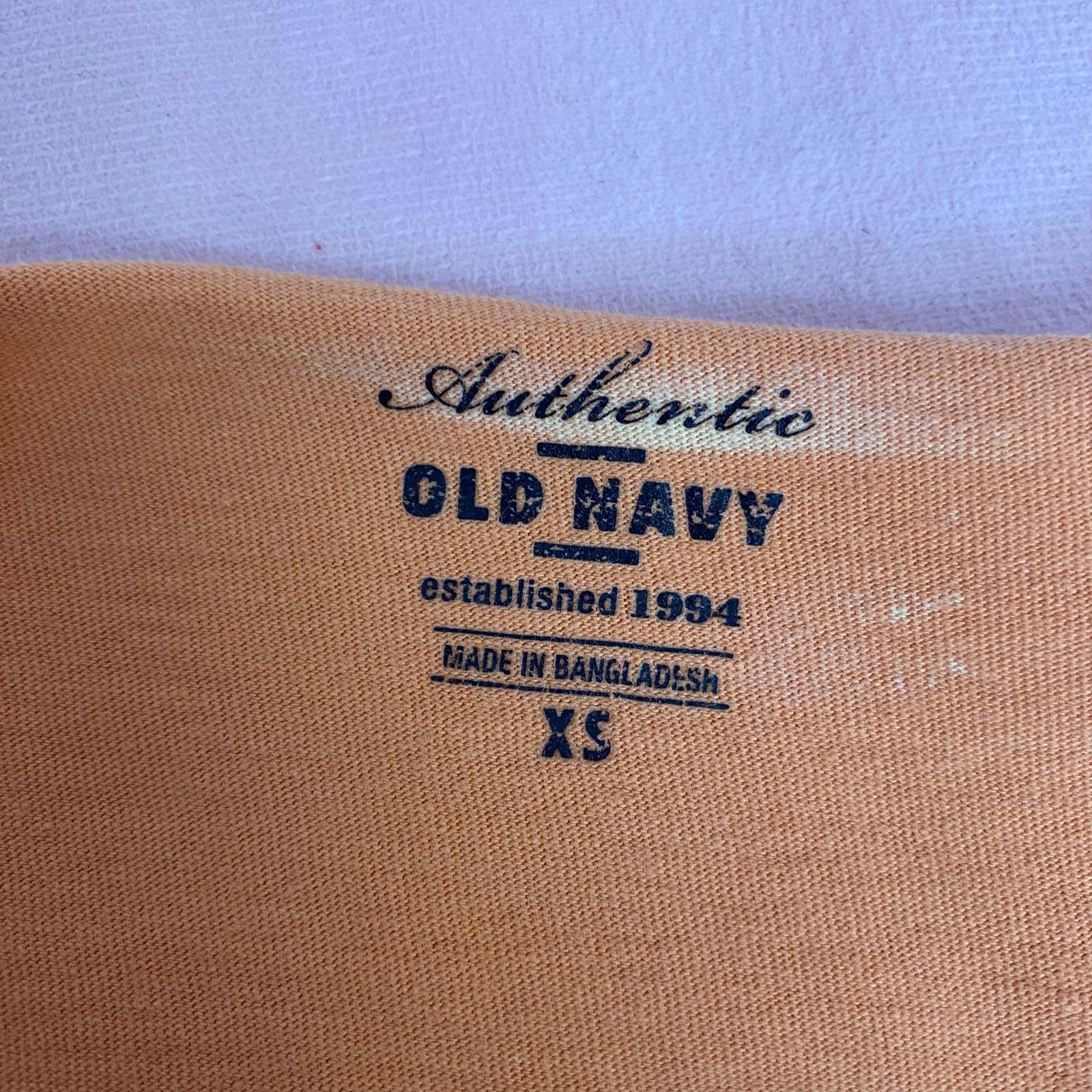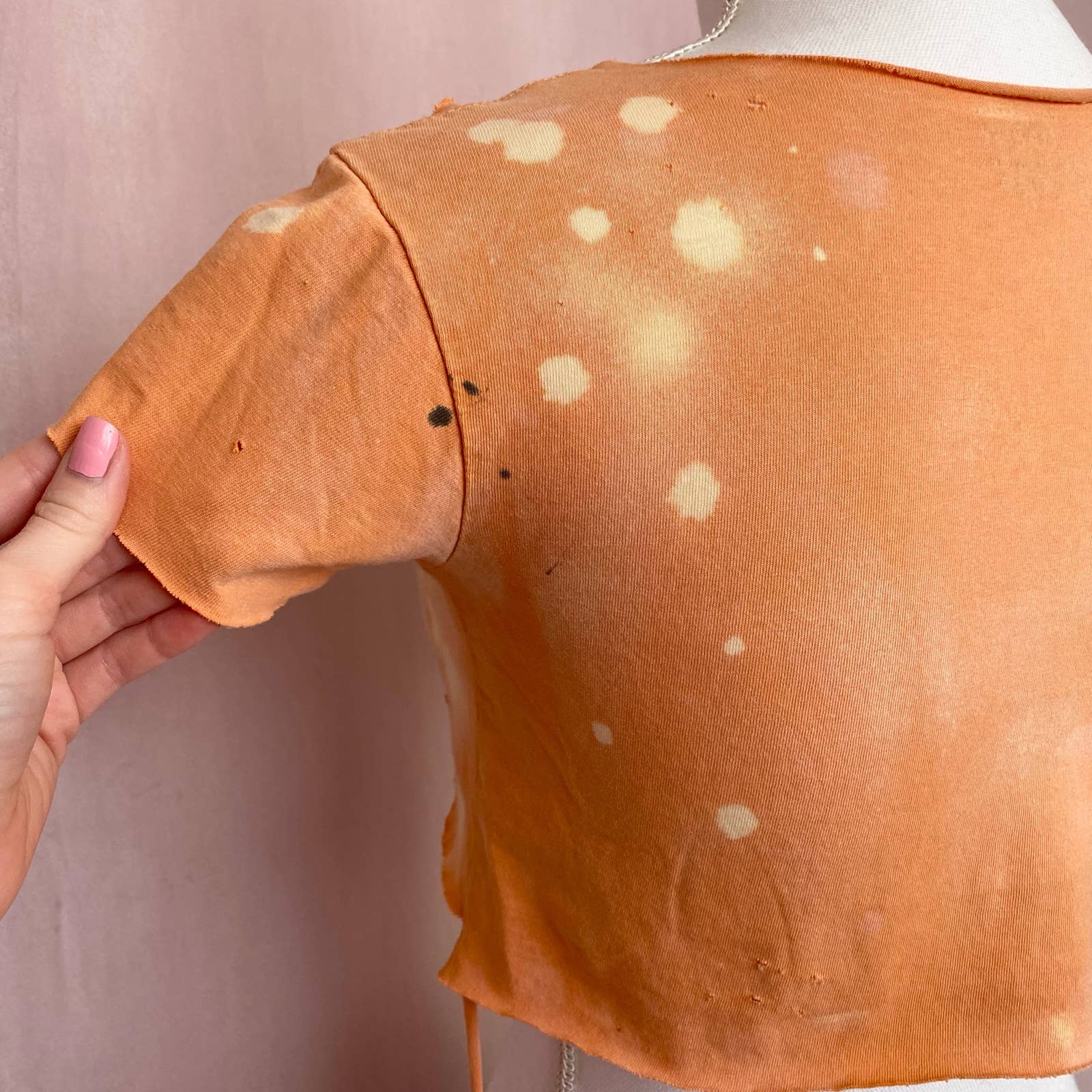 upcycled old navy orange acid washed ripped bleached cropped short sleeve puffer fish graphic t-shirt with dangly beaded fabric strips. soft lightweight stretchy fabric