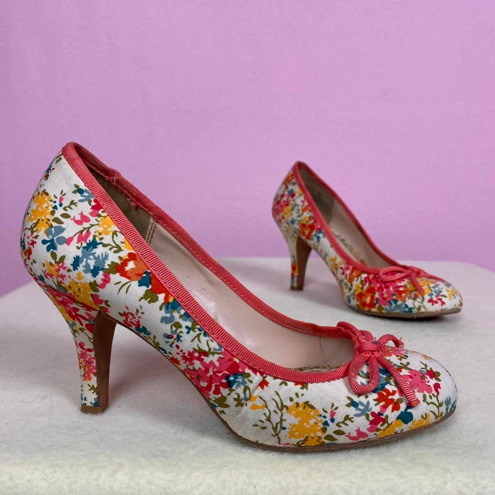 closed toe low 3” stiletto heel | cute lil peach bow & lining, flower floral design