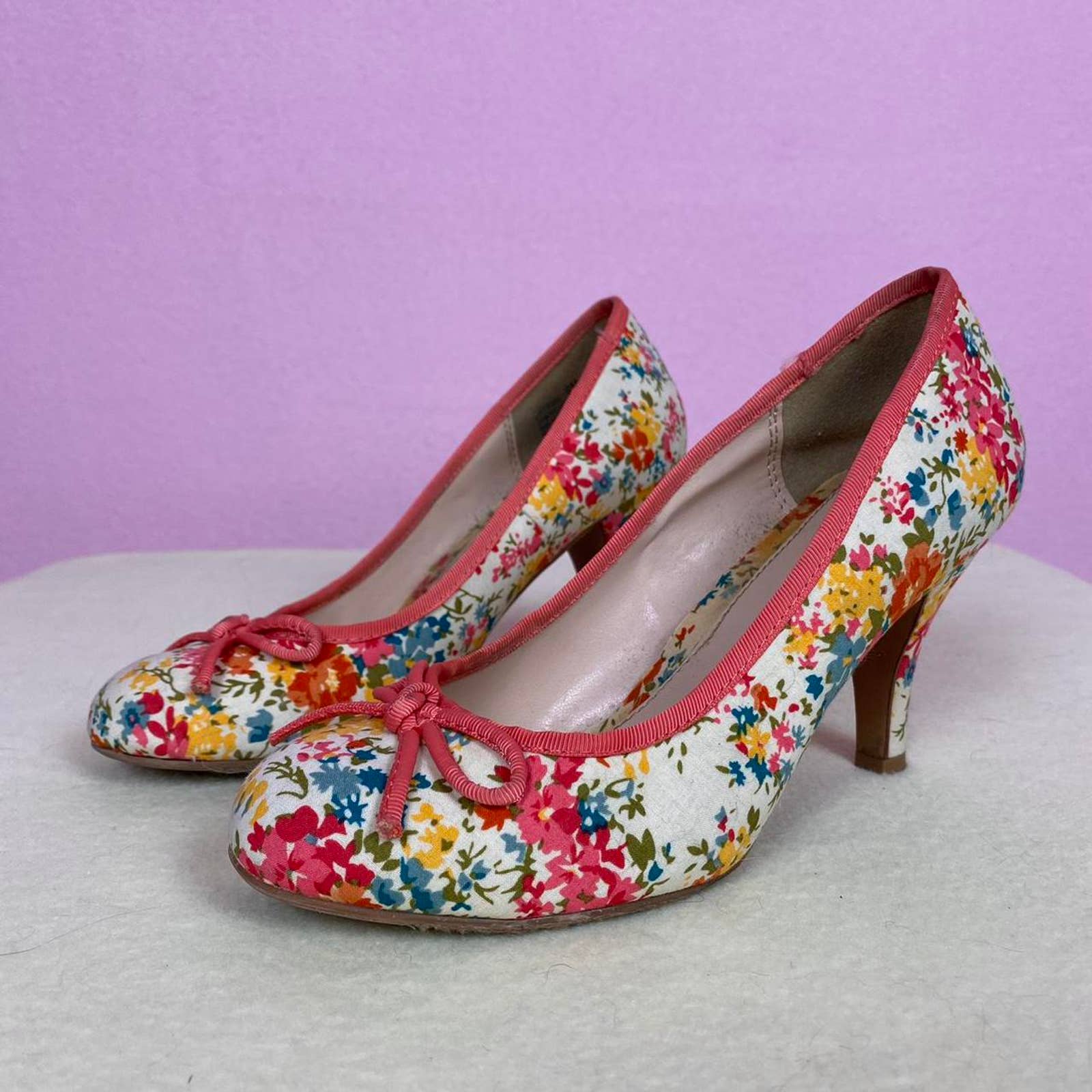 retro bright peach floral victorian y2k closed toe kitten heels, size 6 women's