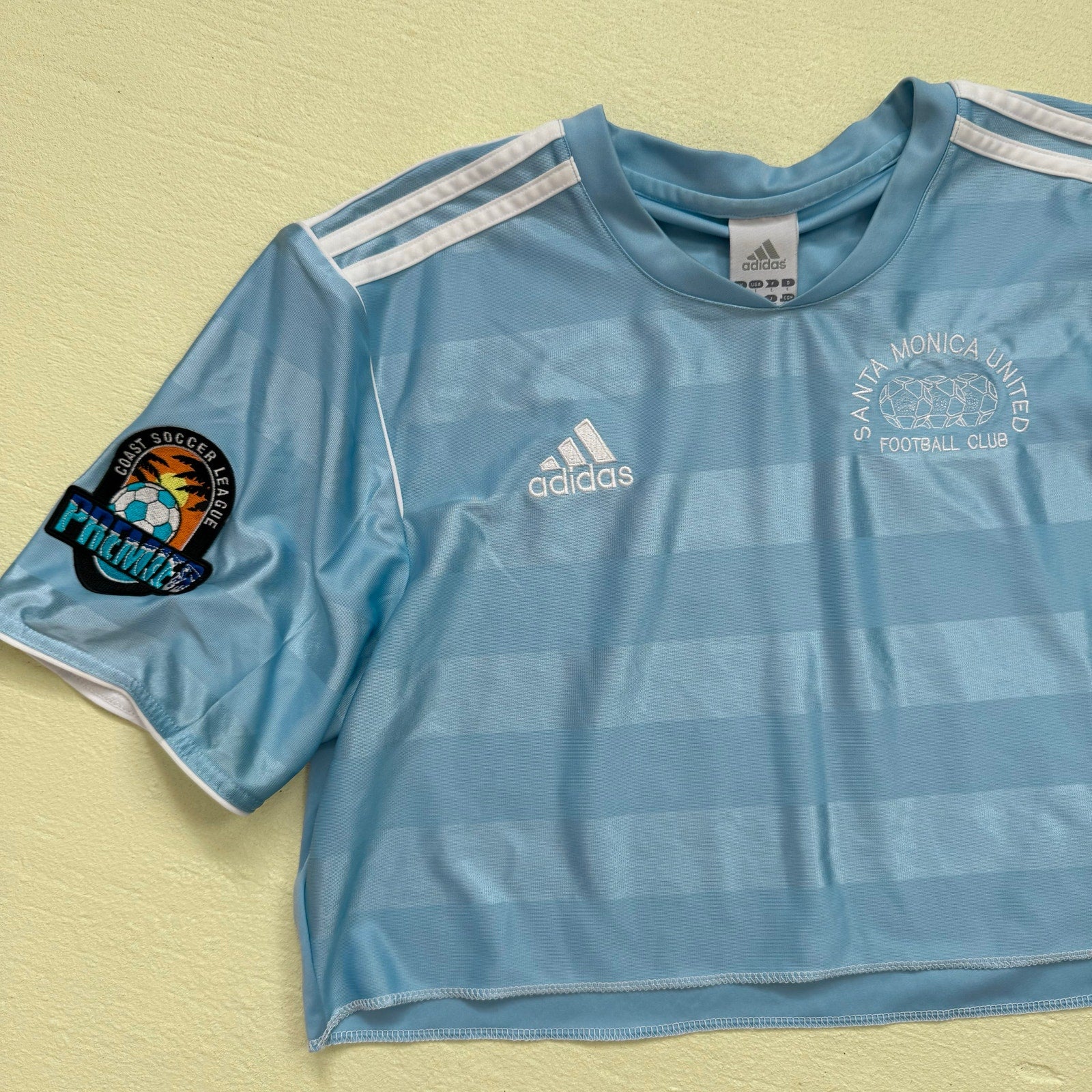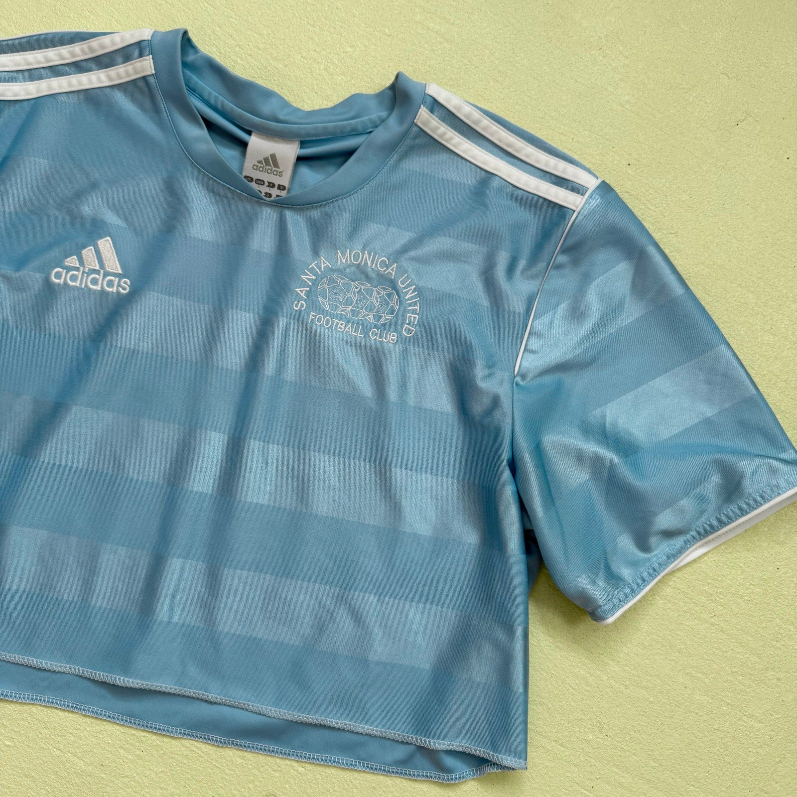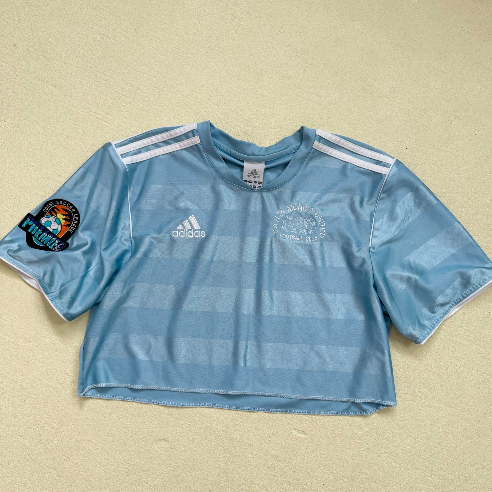 upcycled baby blue santa monica football club cropped short sleeve soccer jersey with # 3 on back & left sleeve patch detail