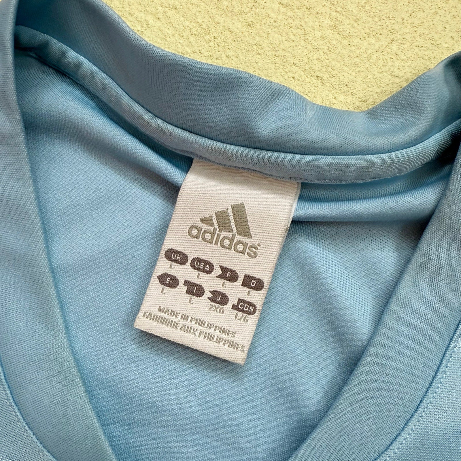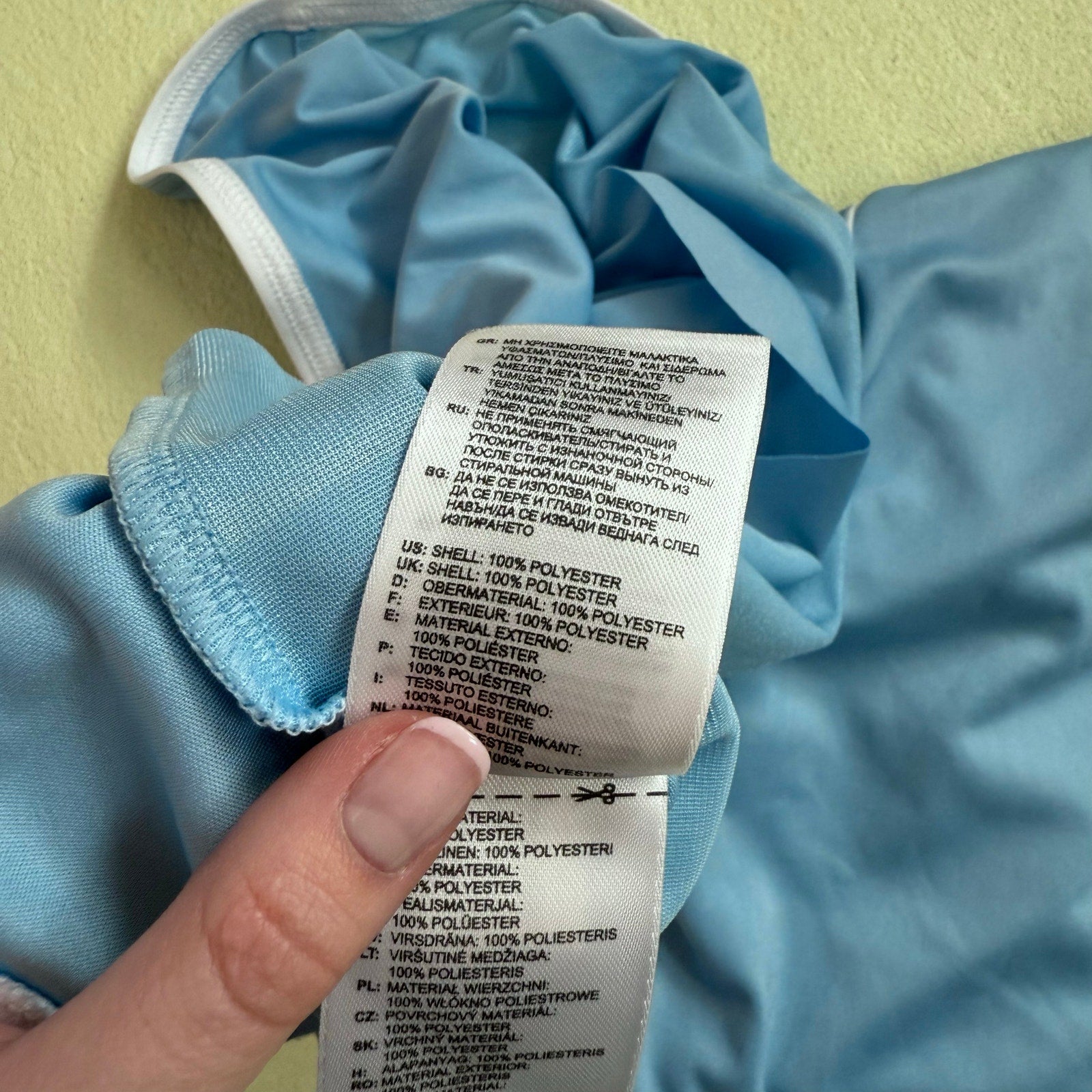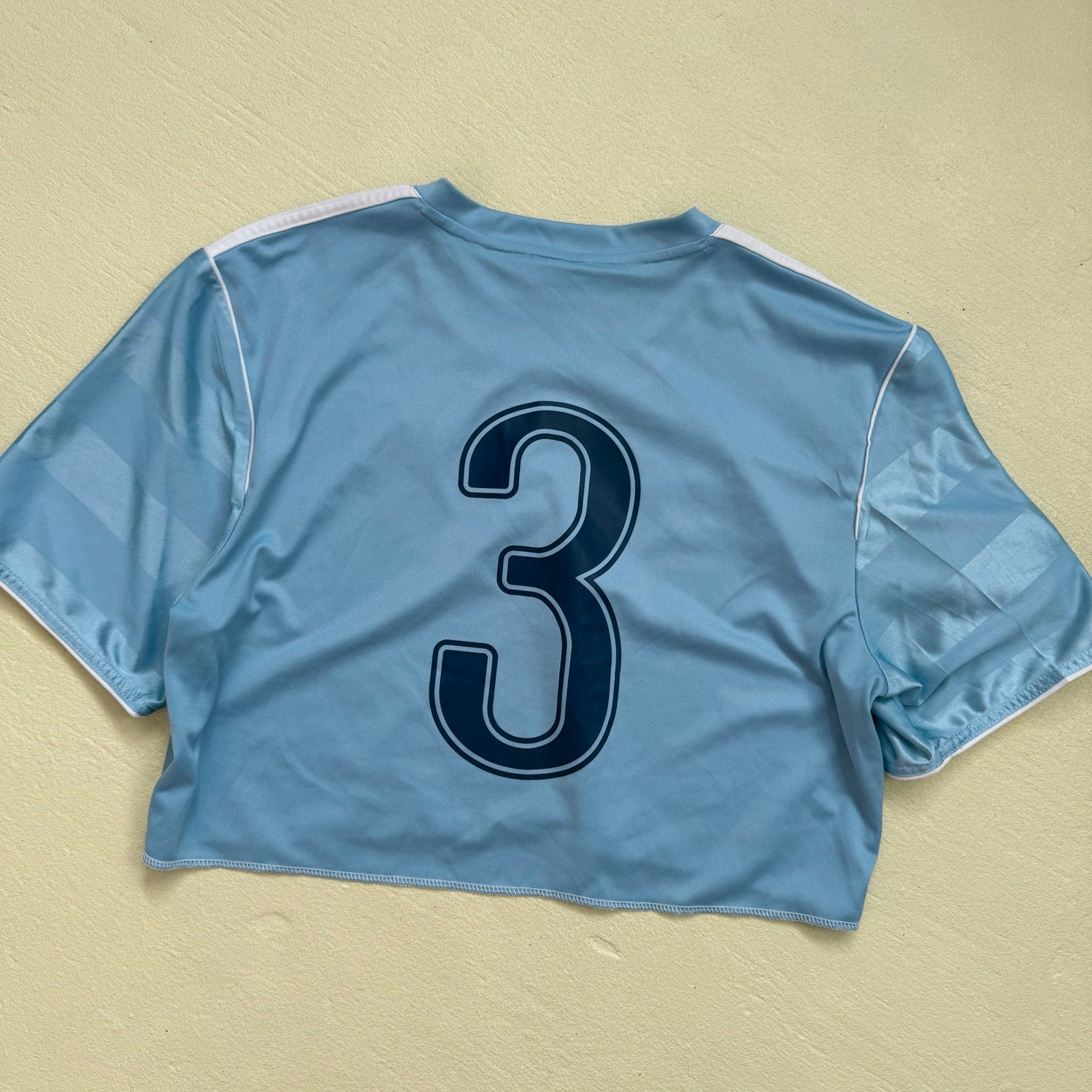 upcycled baby blue santa monica football club cropped short sleeve soccer jersey with # 3 on back & left sleeve patch detail