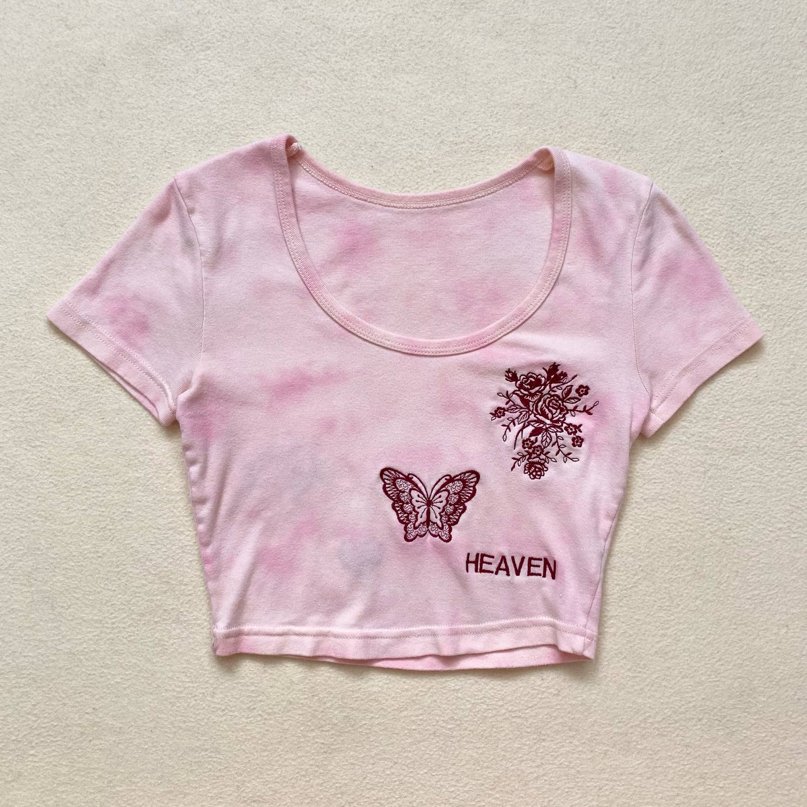 short sleeve pink peach tie dye cropped embroidered fitted baby tee. burgundy butterfly floral “heaven” love cupid heart embroidery detail. soft stretchy cotton. scoop neck