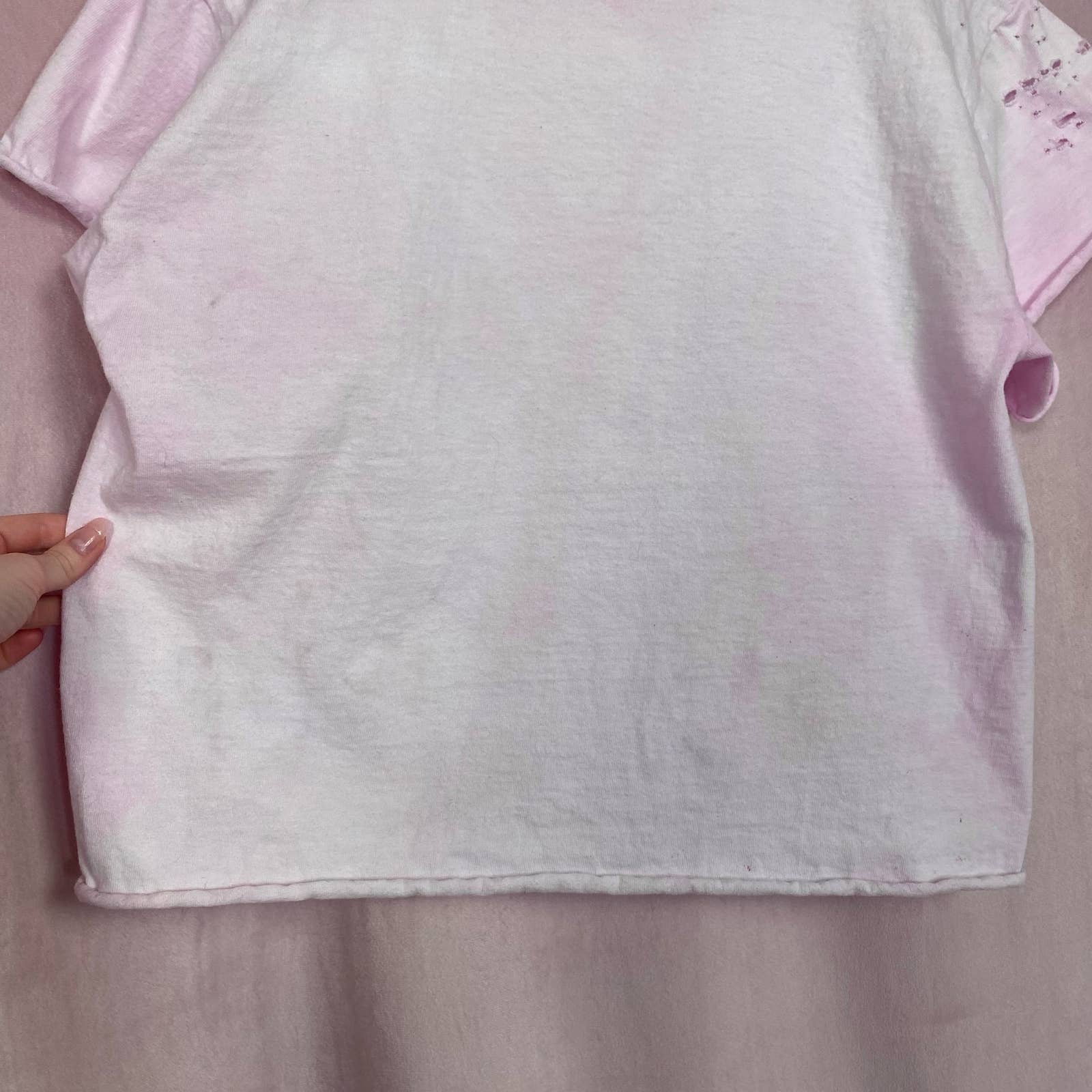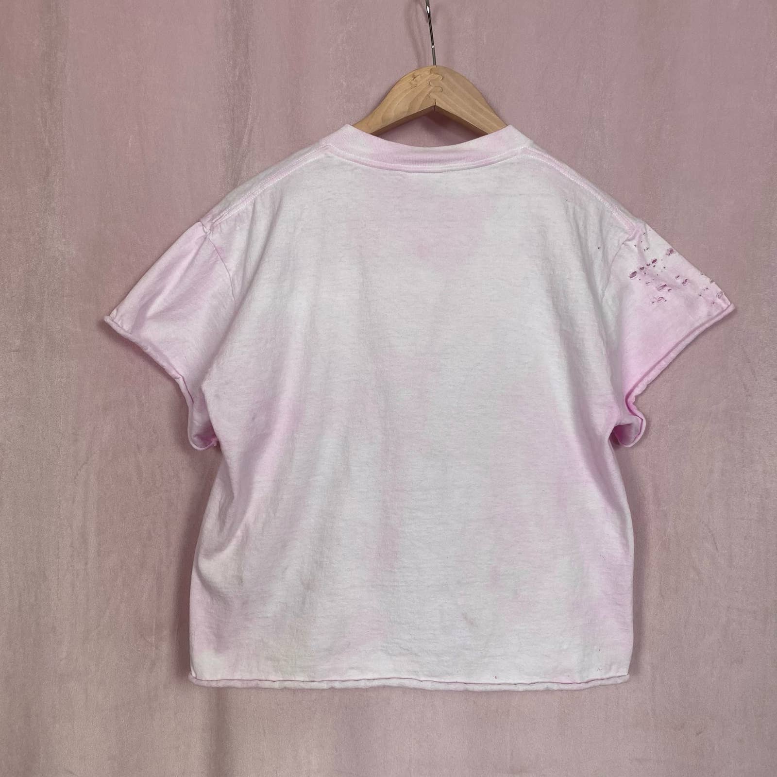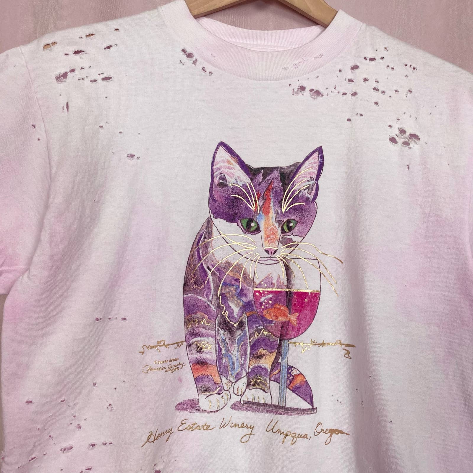 Tultex short sleeve tie dyed light pink destroyed ripped cotton t-shirt with cut off sleeves & bottom hem. lightly cropped. Henry Estate Winery Oregon cat wine pink metallic gold multicolor graphic print