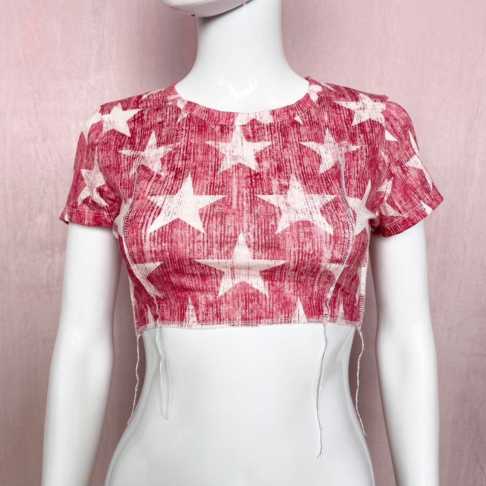 This one-of-a-kind star print tee was reworked into a cropped fit with dangly serged seam details. Stretchy and soft with a slightly faded red-white wash and allover star print. Tagged Petite/Small and fits like an XS/S. Has a small faint stain on the front (pictured). Great for layering or pairing with cargos or cutoffs for a bold grunge or Americana look.