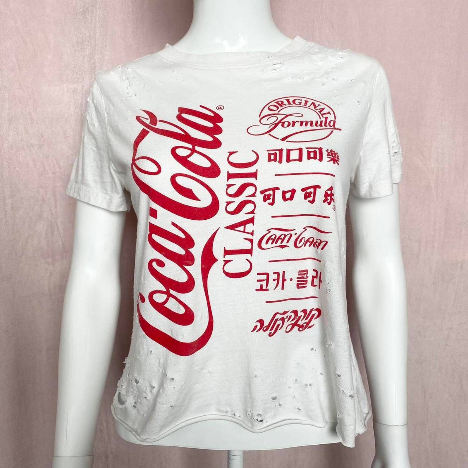 short sleeve destroyed ripped white cotton Coca Cola Classic red graphic t-shirt with different languages. retro vintage style. cut off raw bottom hem. soft stretchy lightweight fabric. relaxed fit