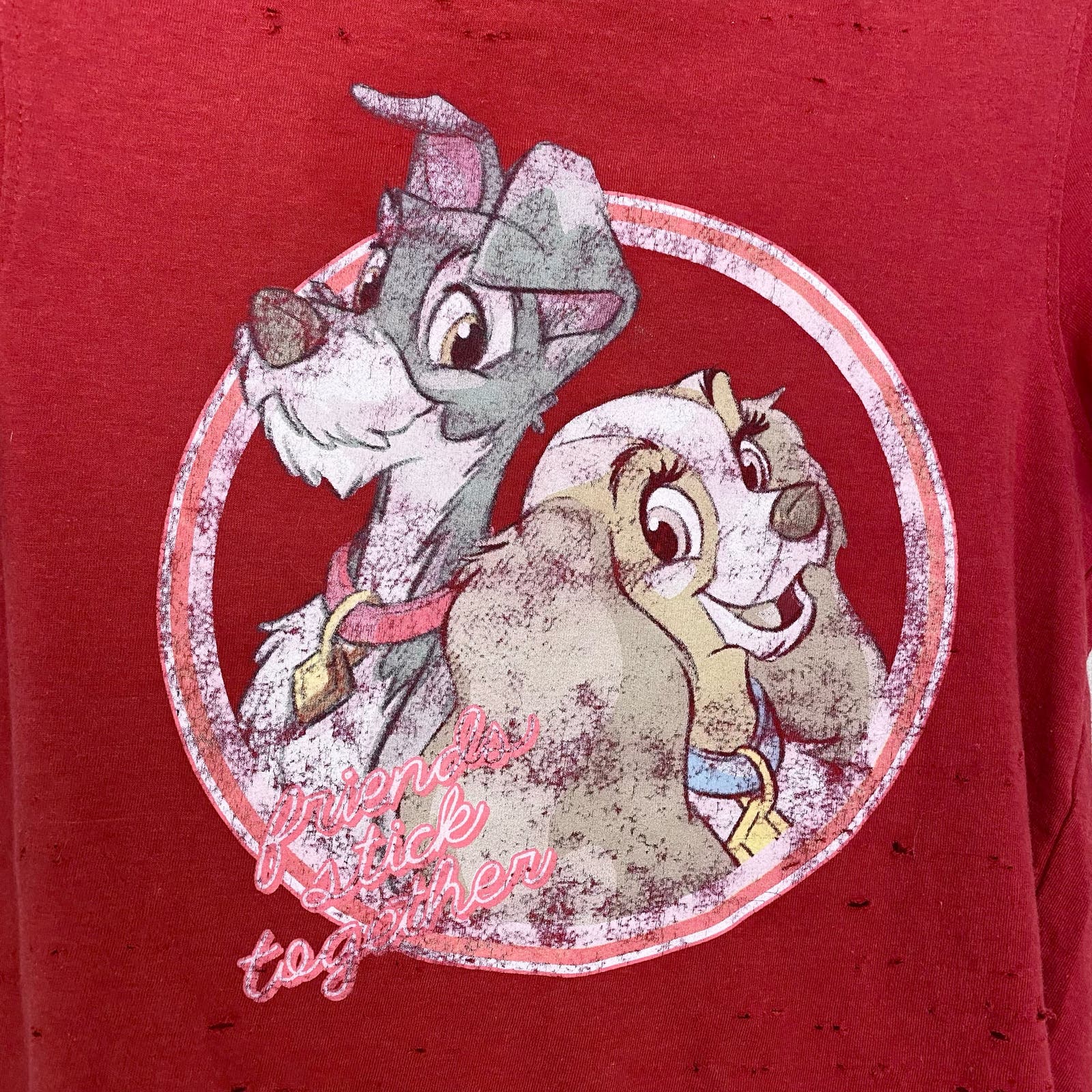 short sleeve red distressed ripped cropped t-shirt top with lady and the tramp disney "friends stick together" retro graphic print. soft lightweight stretchy cotton blend fabric. cut off raw sleeve & bottom hems. fits smaller, please see measurements for best fit!