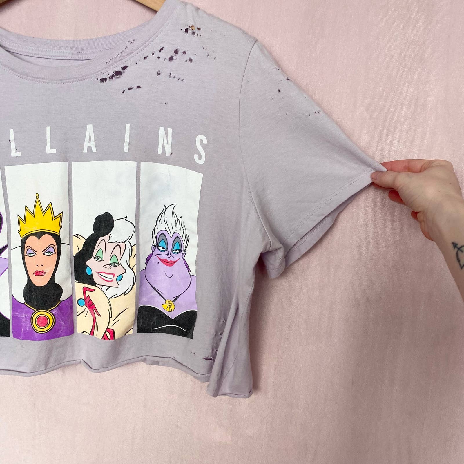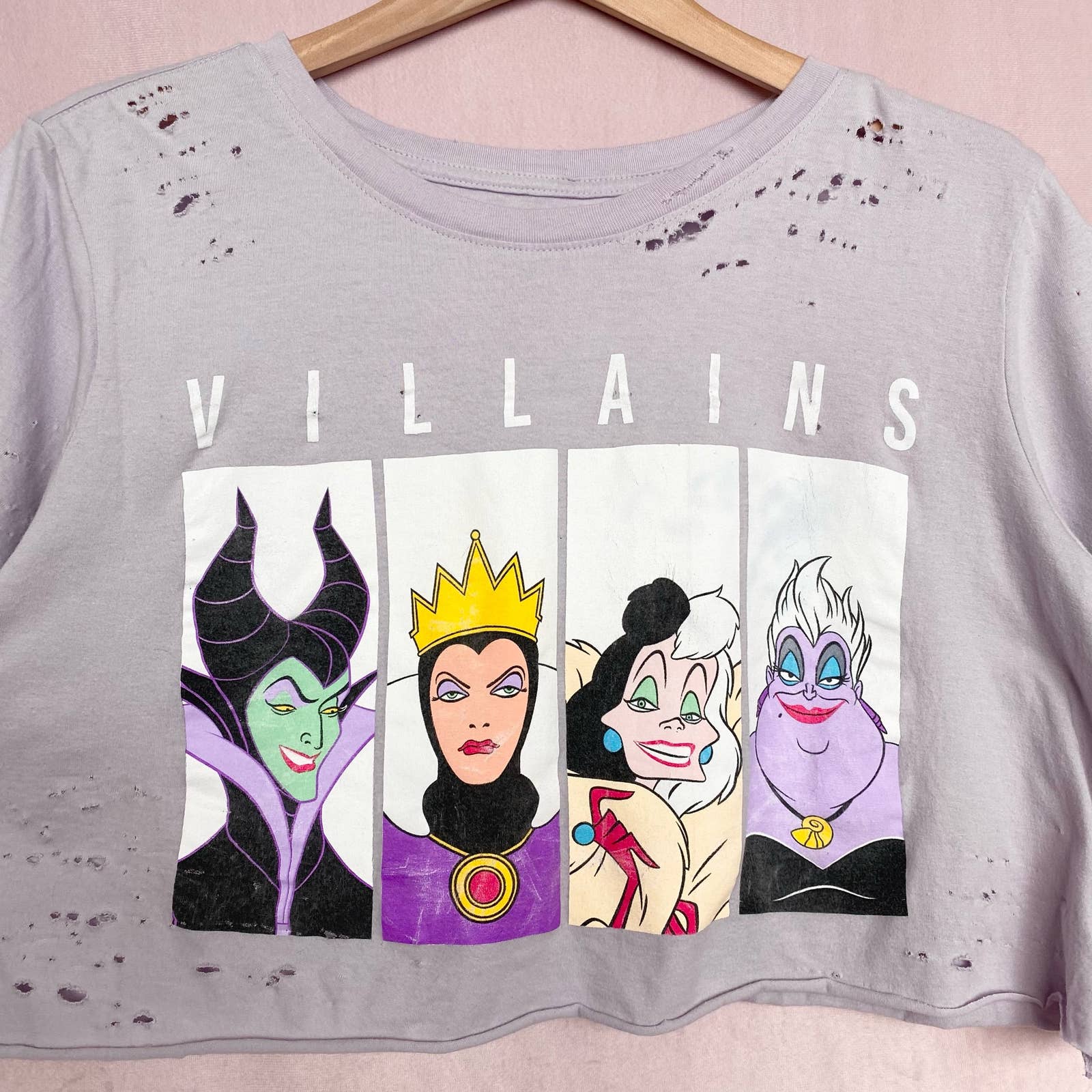 light purple-gray Disney villains graphic destroyed ripped cropped t-shirt. stretchy soft lightweight cotton fabric