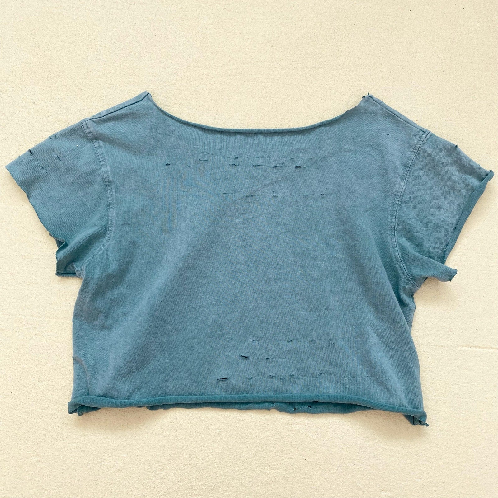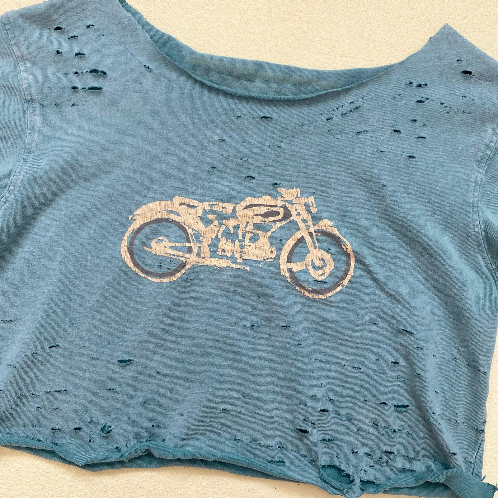 upcycled distressed motorcycle graphic cropped short sleeve t-shirt baby tee with raw hems & tears throughout. lightweight soft stretch cotton fabric. youth tee, fits women’s XS best - please see measurements!