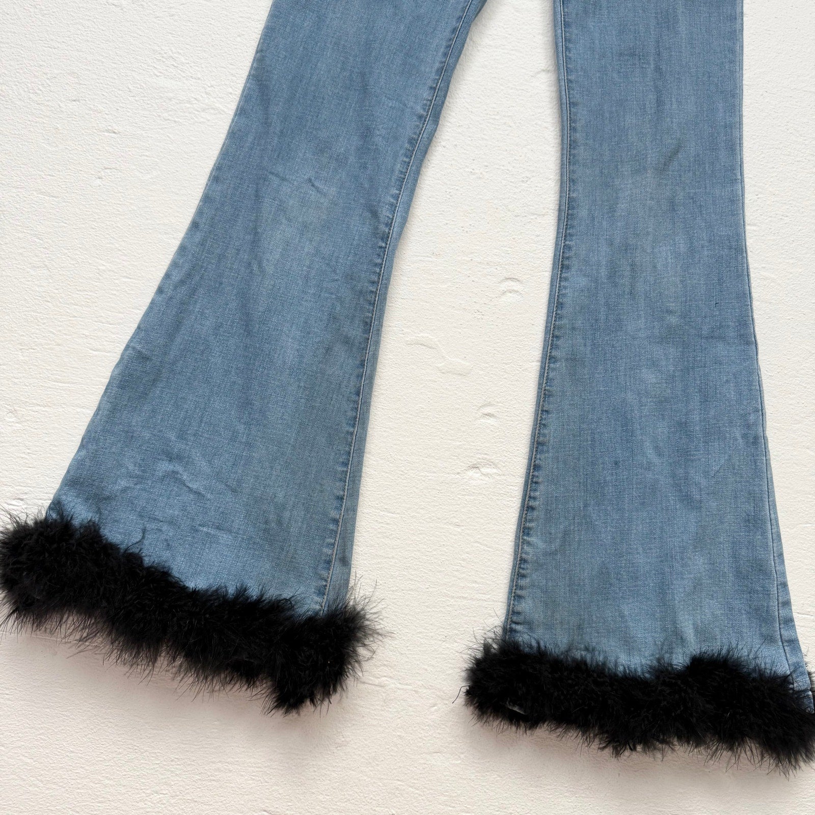 these reworked Edikted high waisted stretch denim flare jeans bring retro y2k vibes with added black feather boa trim at the hems. crafted in soft stretch denim with a flattering mid rise and dramatic flared legs, they make a bold statement piece for festivals, nights out, or standout streetwear looks.