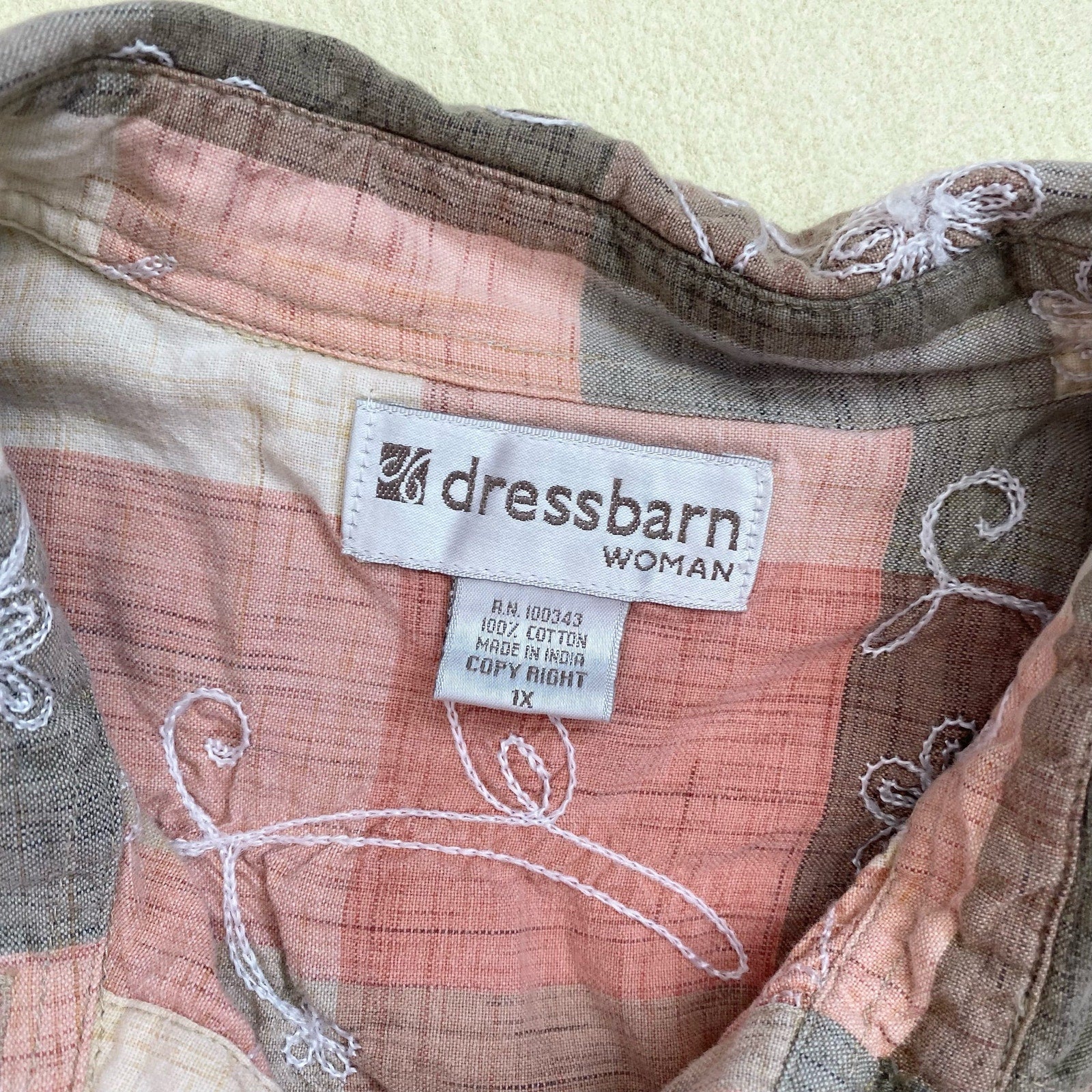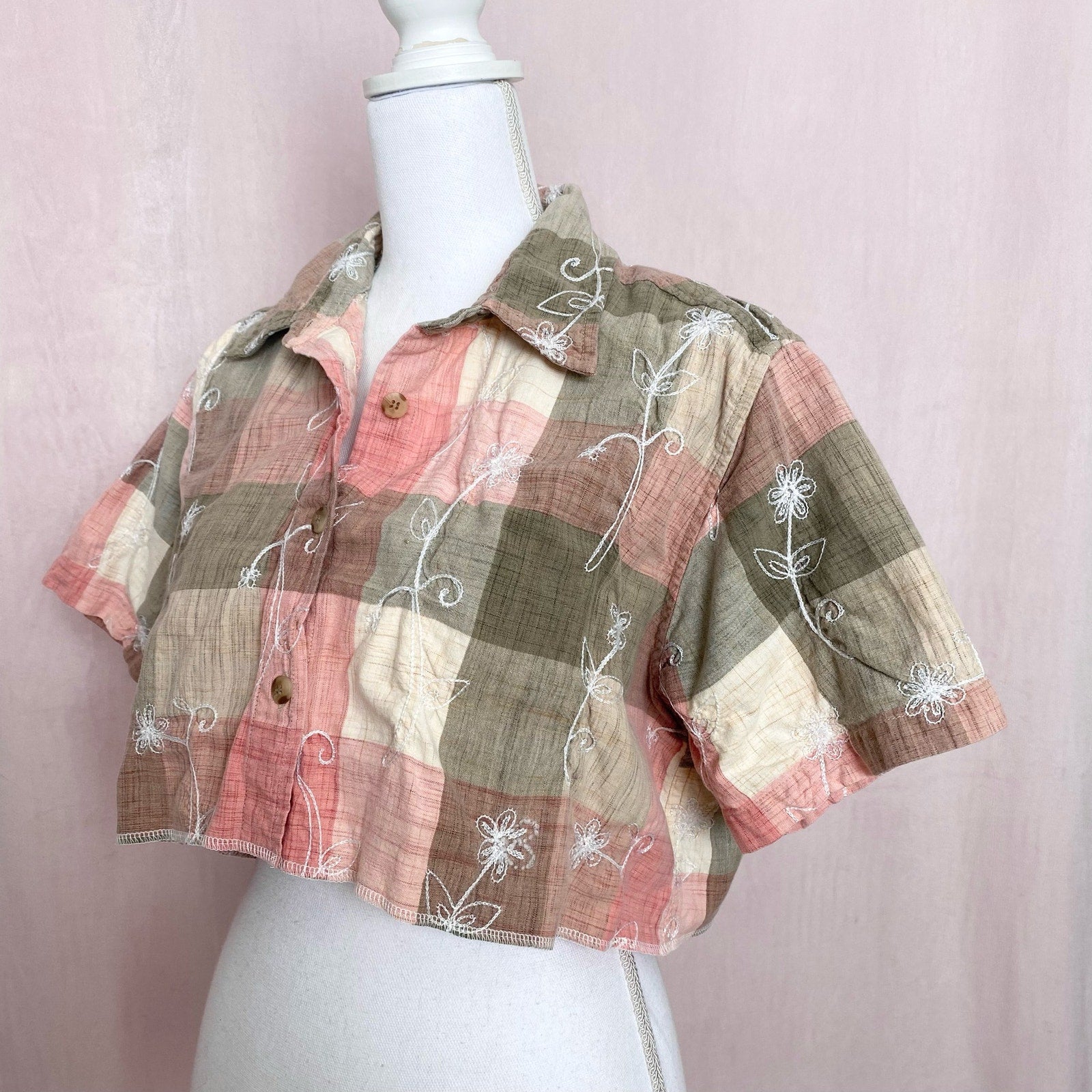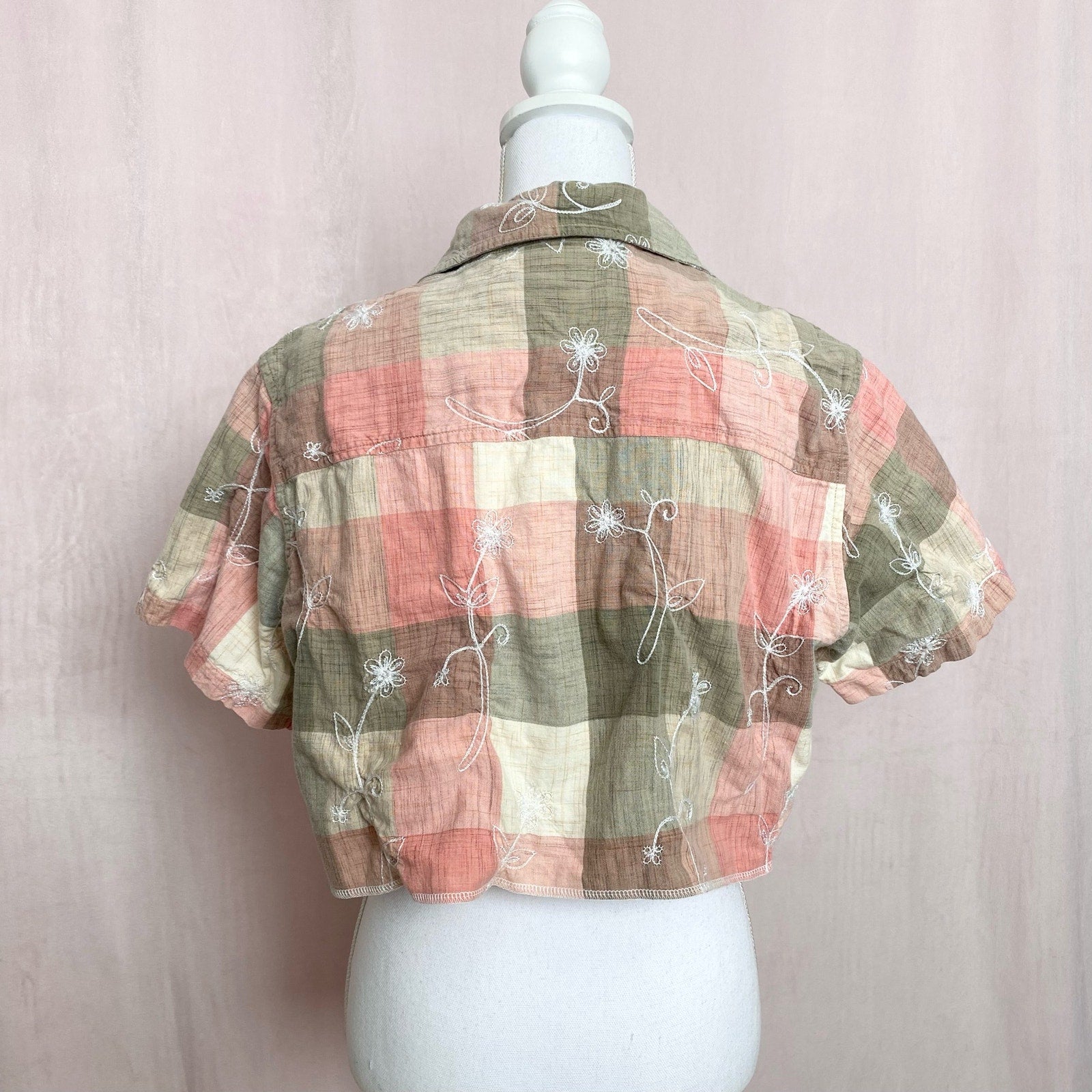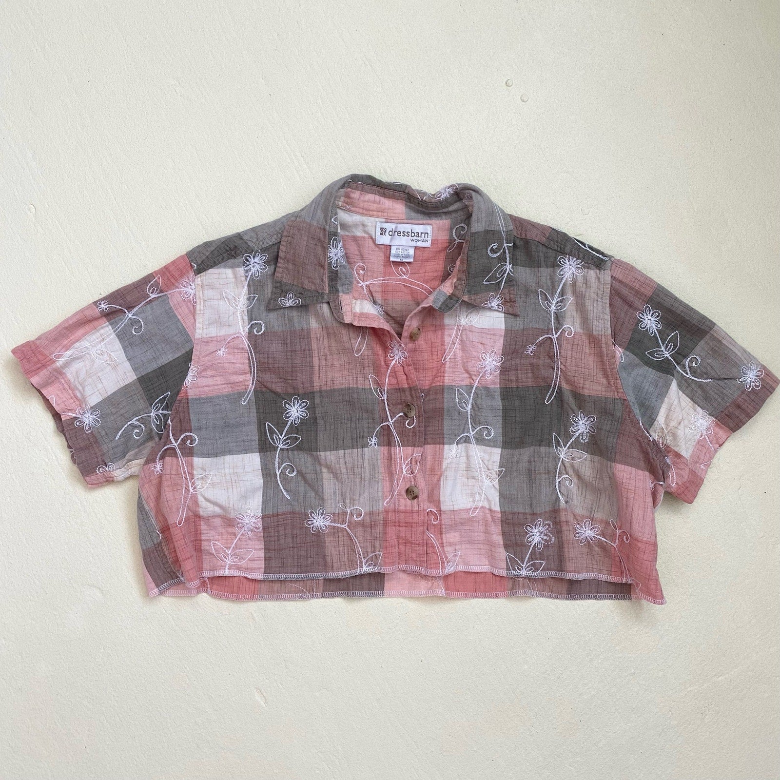 reworked dressbarn cropped checkered plaid floral embroidered crinkled collared short sleeve shirt button down. relaxed fit. lightly warped / crinkled throughout. soft lightweight fabric. outside stitch hem detail. soft woven sturdy lightweight cotton fabric