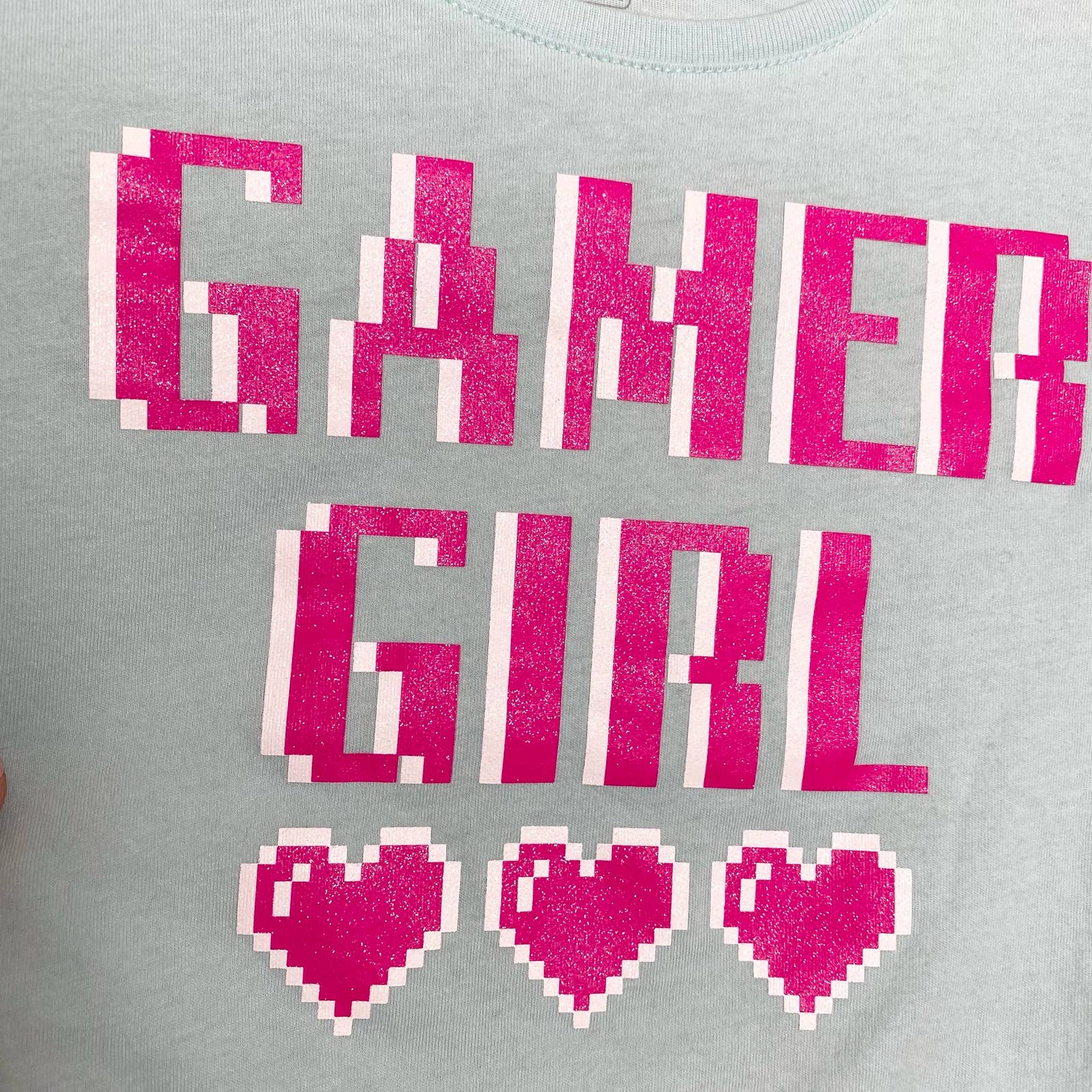 soft stretchy fitted turquoise short sleeve cropped t-shirt with shimmery pink gamer girl graphic print. was a long sleeve upcycled to crop tee. lightly see through thin fabric. marked girls L, fits women’s XS-small