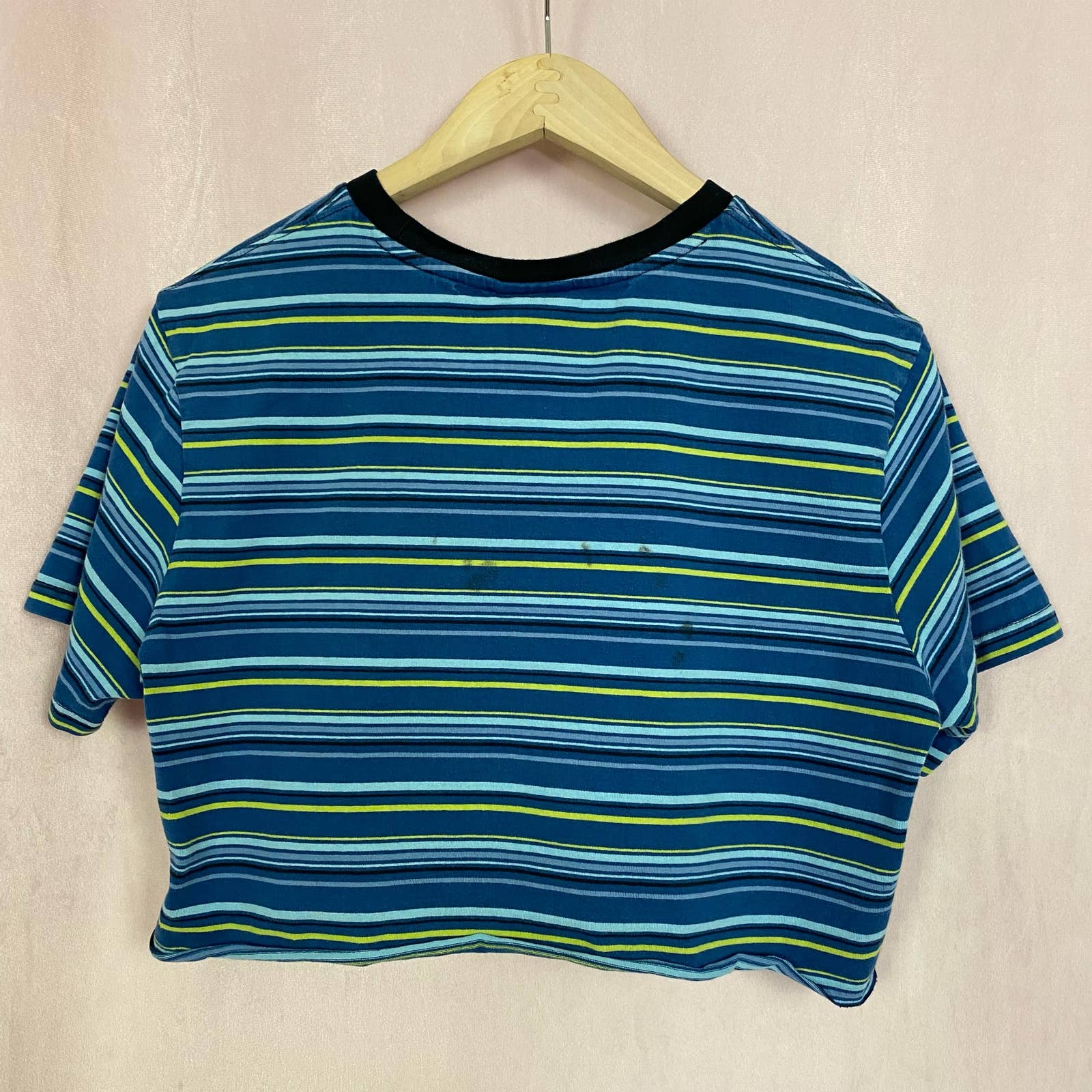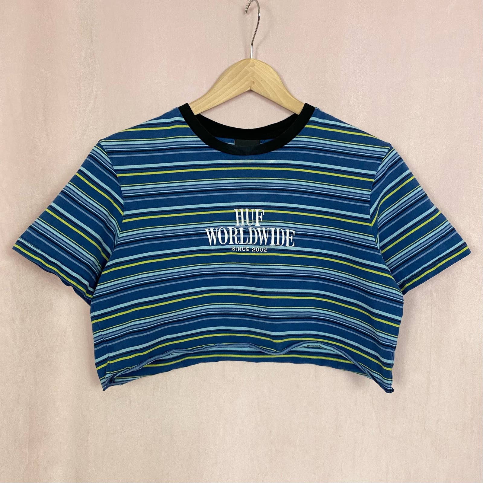 blue green striped knitted short sleeve cropped t-shirt with “Huf Worldwide since 2002” embroidery on front. cut off raw bottom hem. soft stretchy cotton fabric