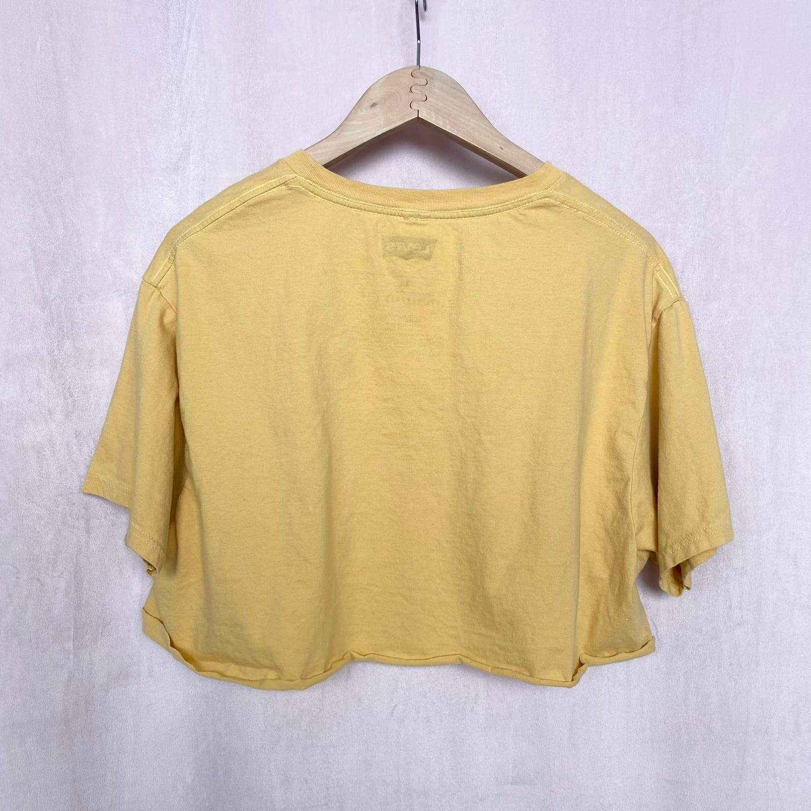 mustard yellow short sleeve Levi's orginal American denim retro graphic cropped t-shirt. super soft stretchy lightweight cotton fabric. size men's XL, fits oversized women's