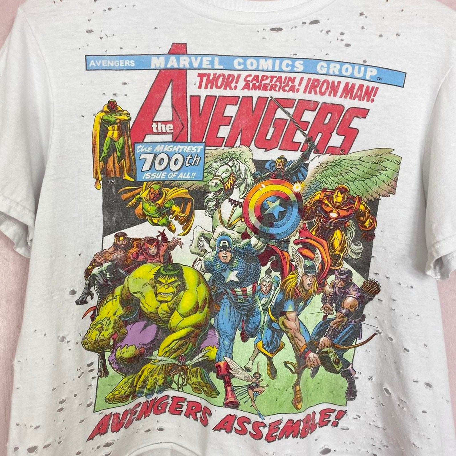 short sleeve destroyed ripped avengers assemble comics graphic print t-shirt feat. thor captain america iron man hulk etc. retro vintage worn style. raw cut off hem lightly cropped. boxy relaxed fit. thin lightweight stretchy cotton fabric. lightly see through