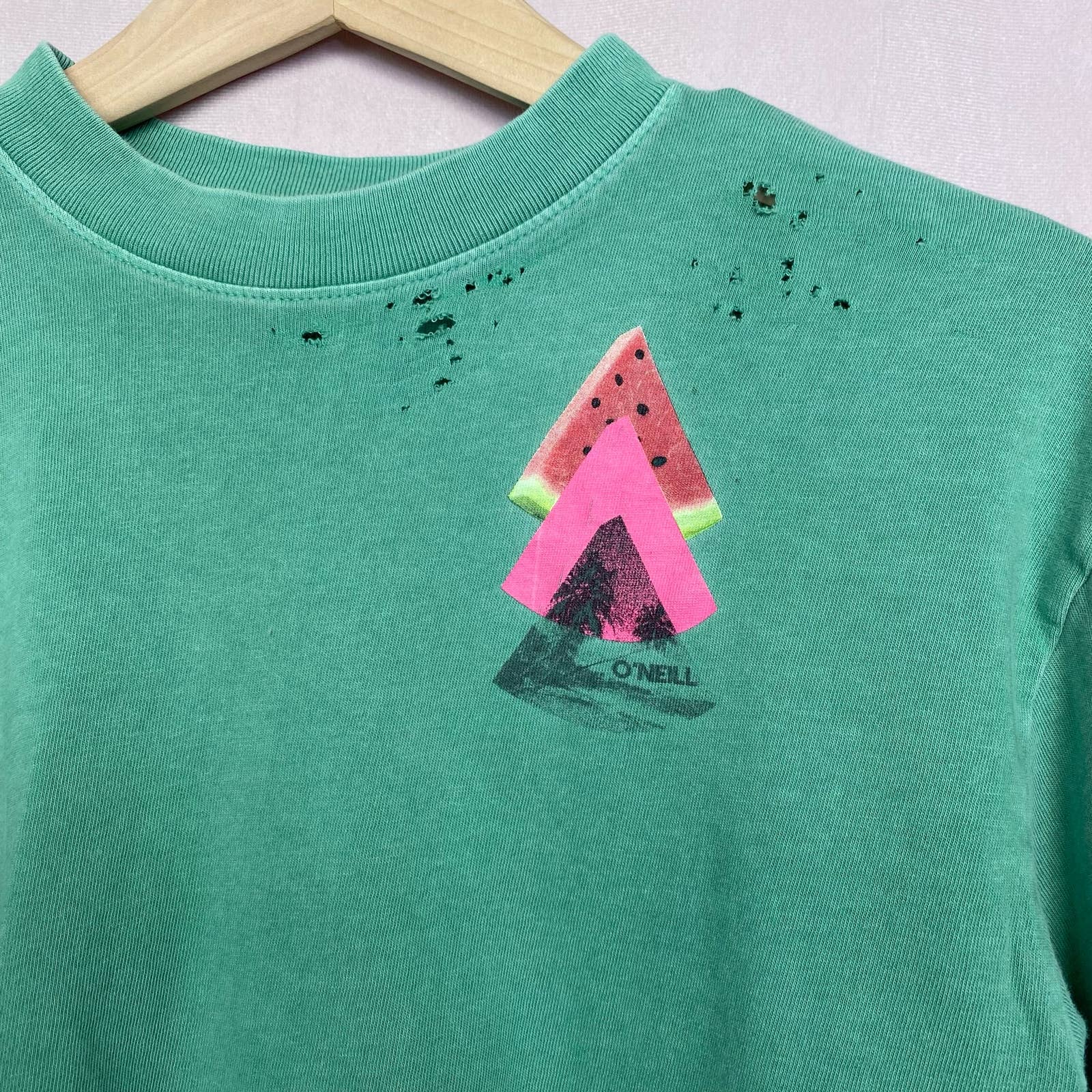 mint forest green short sleeve cropped destroyed ripped soft cotton t-shirt with O’Neill brand watermelon left chest print. stretchy fabric. cut off raw bottom hem. relaxed oversized fit