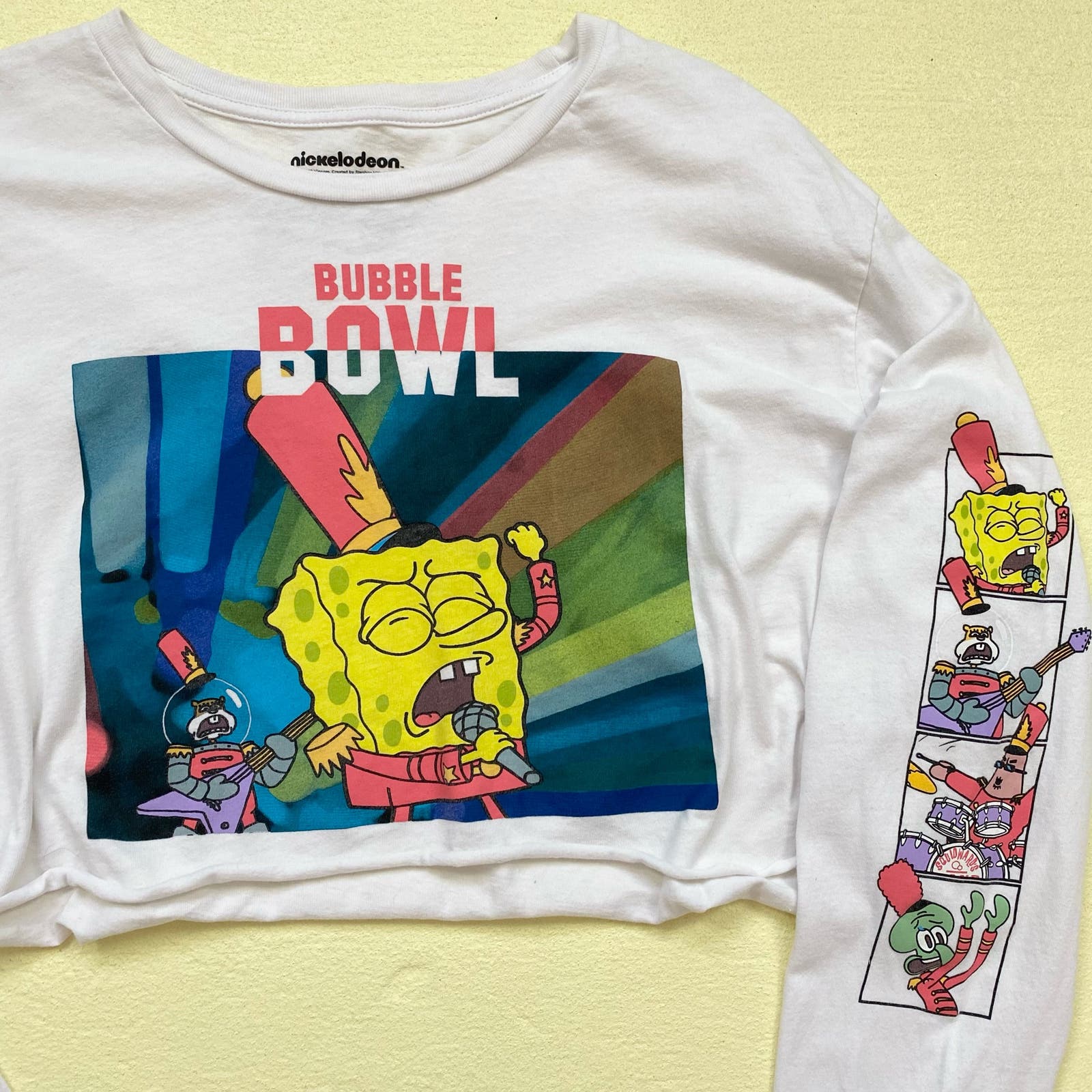 Nickelodeon Spongebob Squarepants bubble bowl graphic print cropped long sleeve t-shirt with graphic down left arm. raw bottom hem. thin lightweight soft worn cotton fabric. marked men's 3XL, fits oversized womens