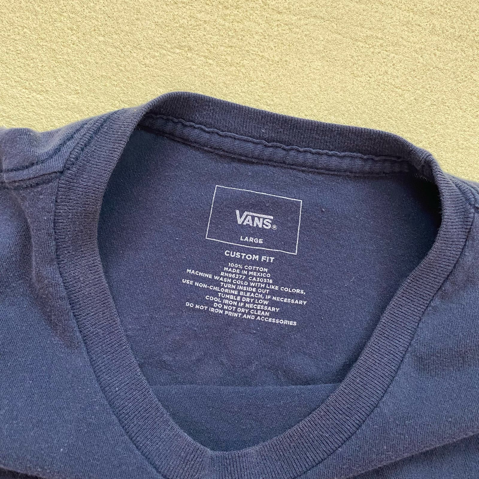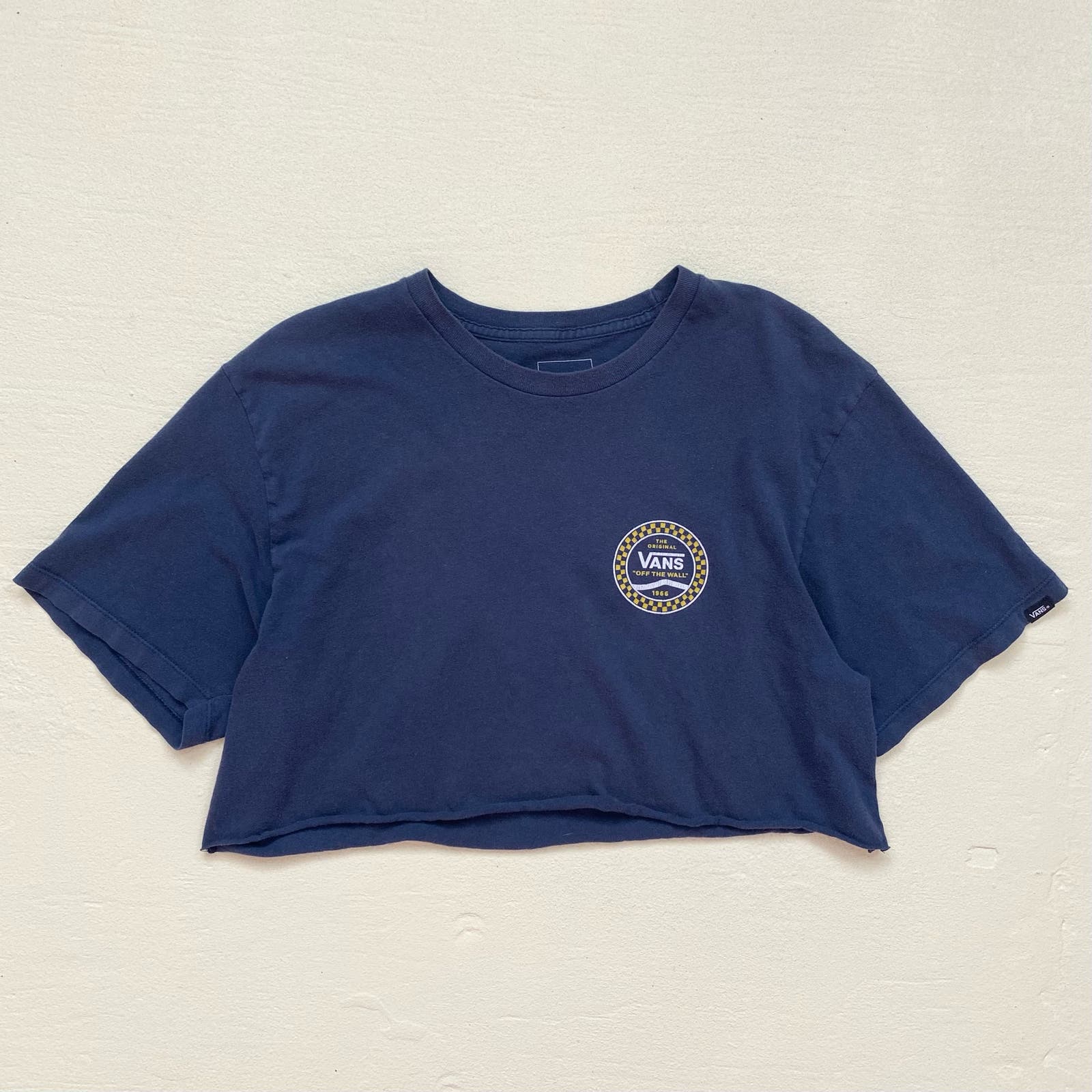 faded navy blue Vans graphic cropped short sleeve t-shirt with small left chest front graphic & large full back retro Vans graphic showing in first pic. raw bottom hem. lightweight soft stretchy cotton fabric. men's size large, fits women's oversized
