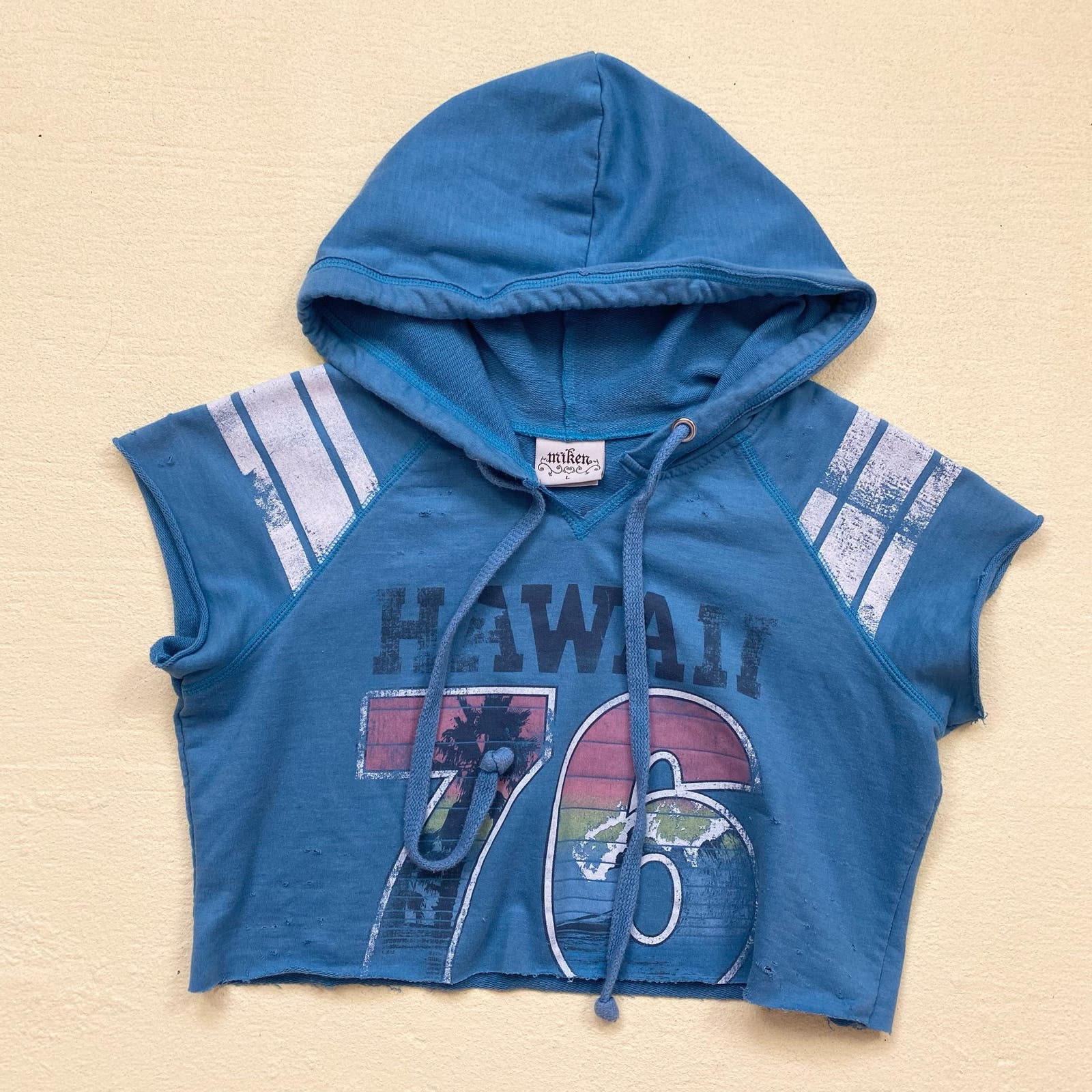 Miken cropped hooded short sleeve sweatshirt with retro faded 76 Hawaii graphic & purposeful light distressing throughout. hoodie with drawstrings. soft cotton blend fabric. marked youth size large, best fits women's xs-small