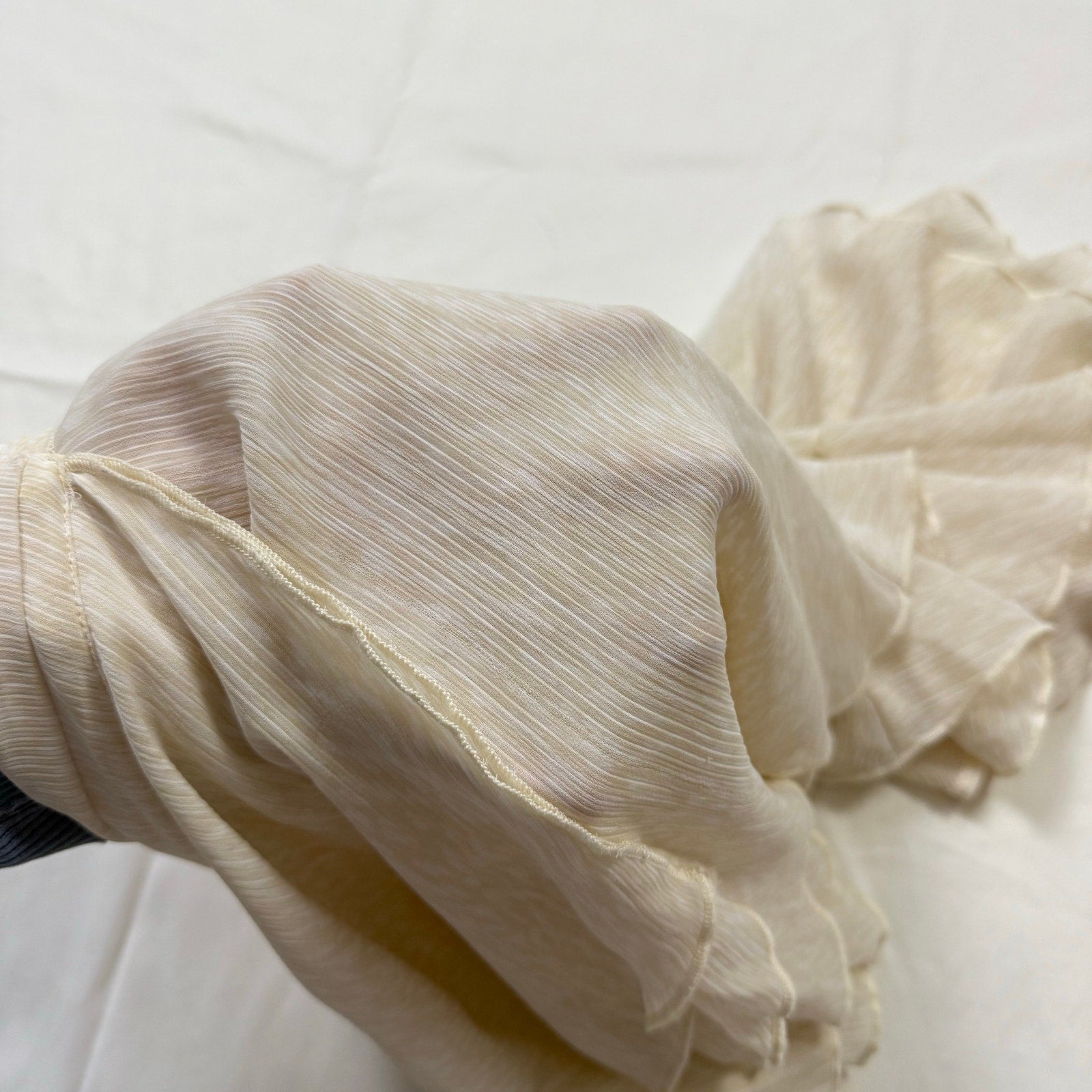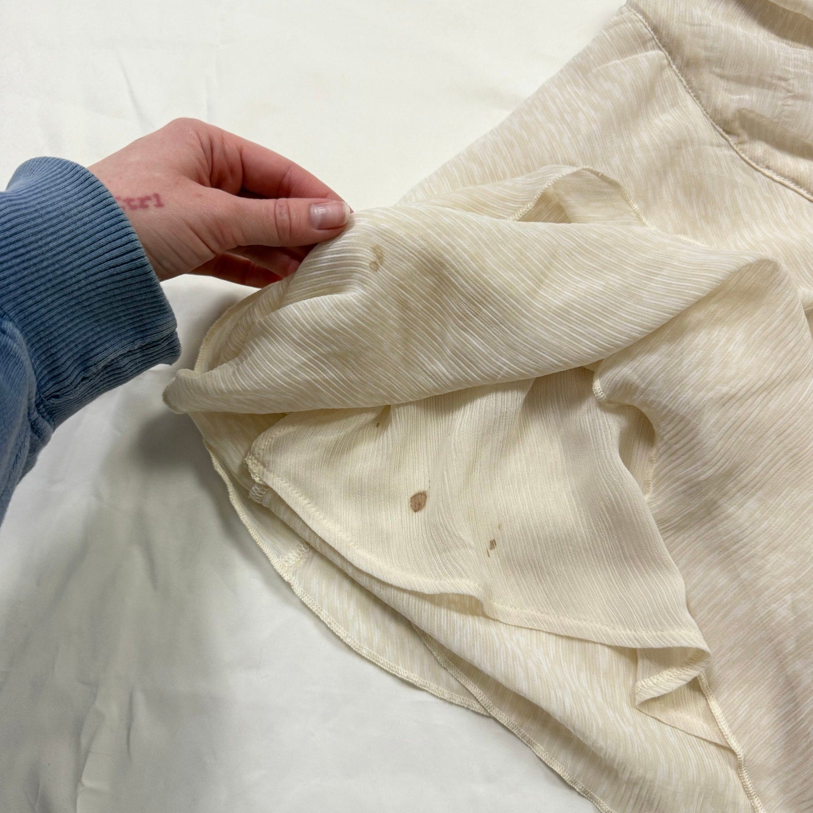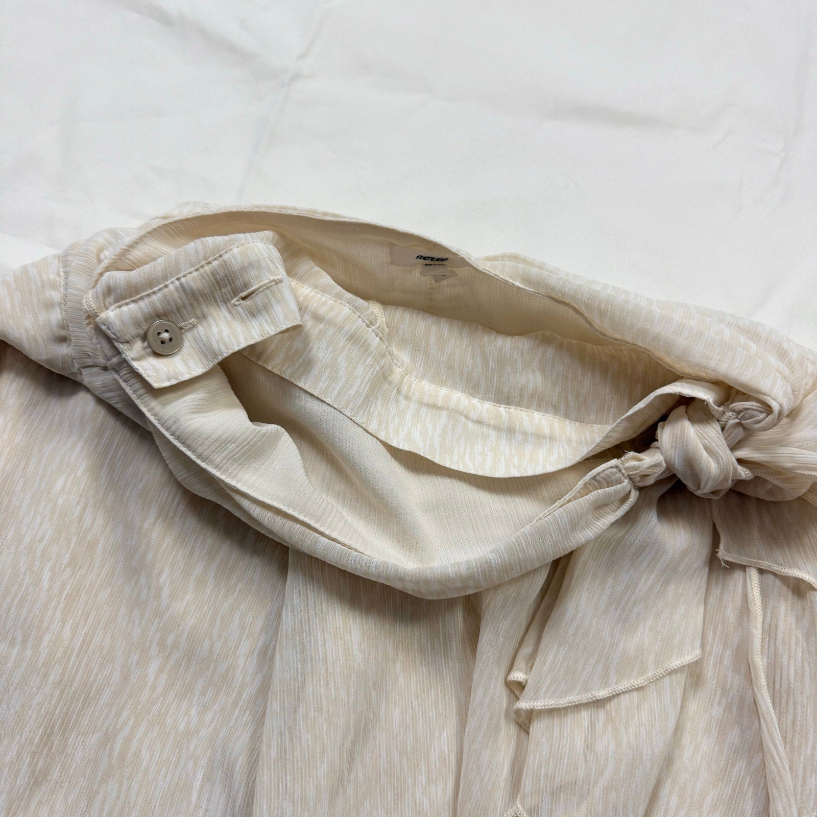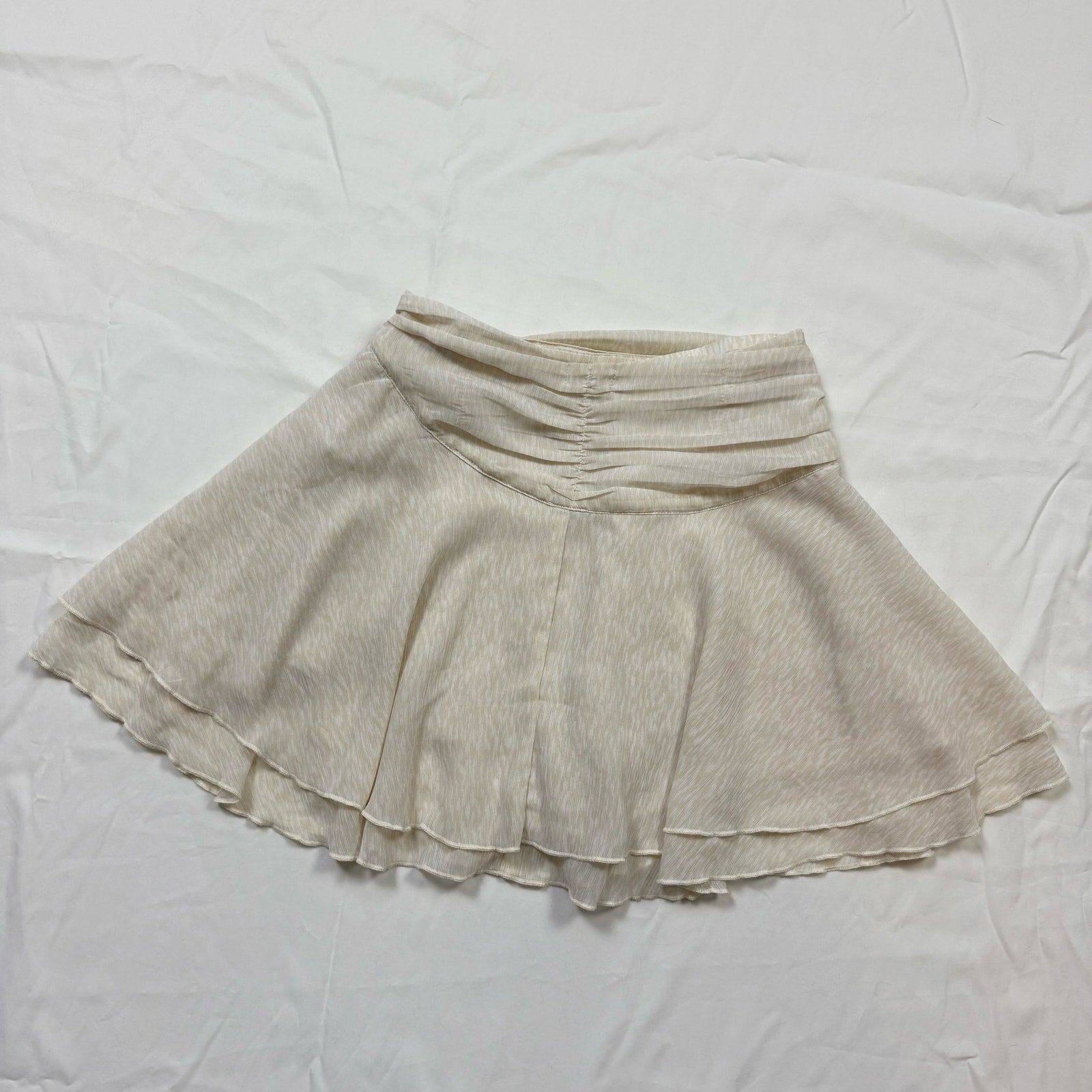 cream beige chiffon sheer flowy tiered ruched wrap mini skirt with front side tie. adjustable tie & inside button. lightly see through
