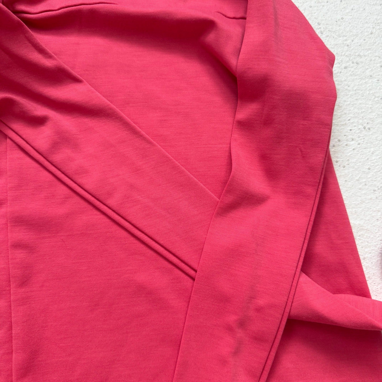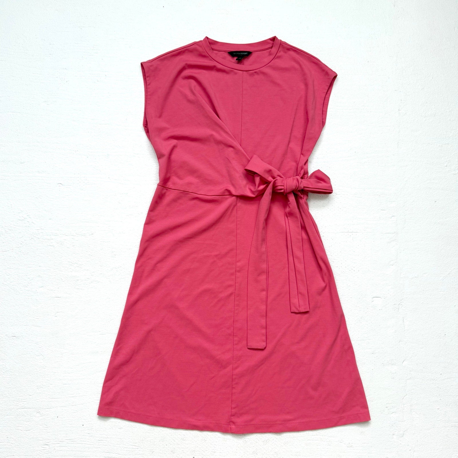 Super flattering Banana Republic dress in a rich pink/peachy pink stretch knit fabric. Features an adjustable waist tie that can be cinched for a more defined silhouette, soft and breathable stretch blend, and an above-knee/knee length cut. Ideal for work, brunch, or day-to-night styling.