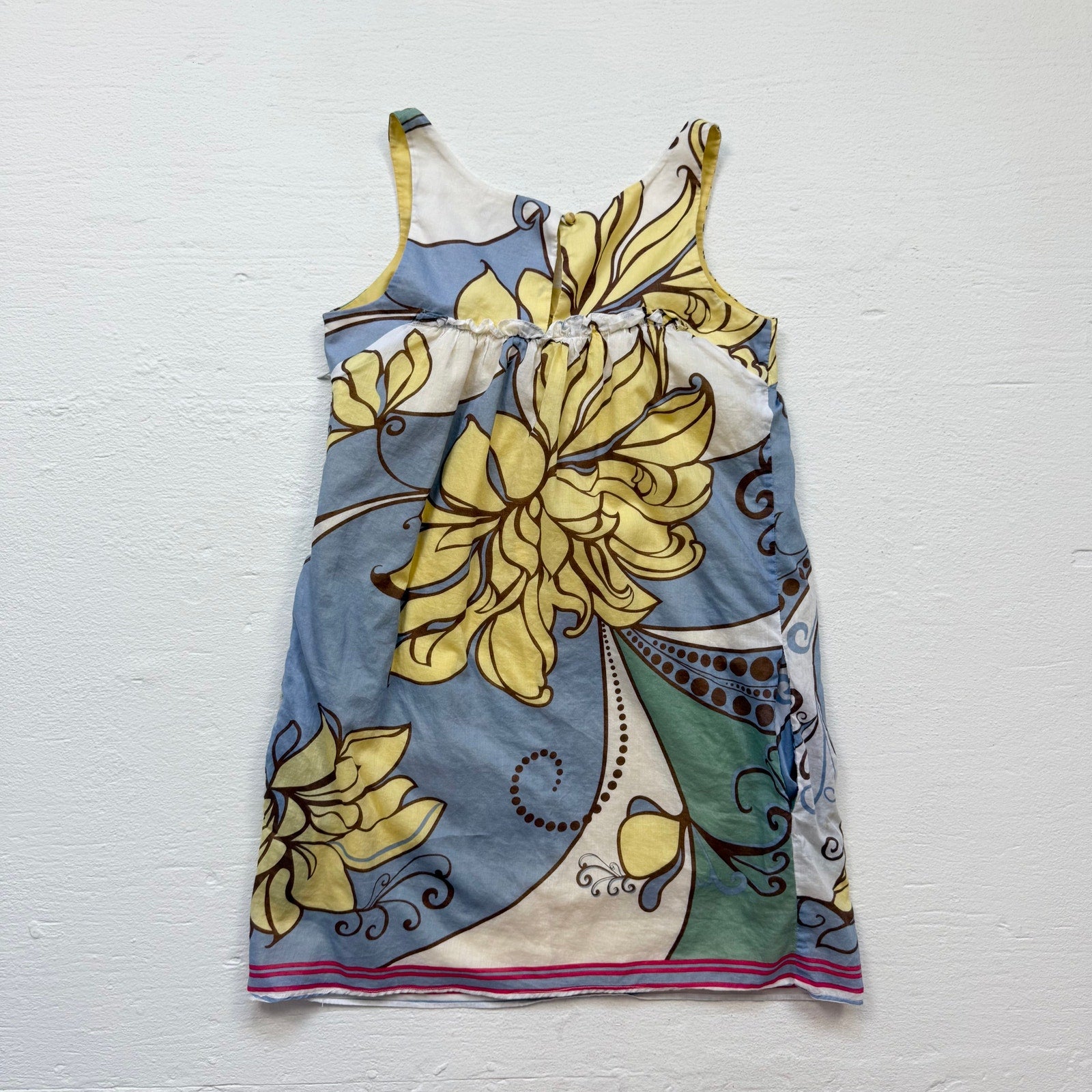 lightweight cotton mini dress with a bold floral print in yellow, blue, and green tones. features a sleeveless cut, full cotton lining, and hidden side pockets for functionality. the vibrant design gives it an airy, summery vibe — perfect for casual days, brunch, or vacation looks.