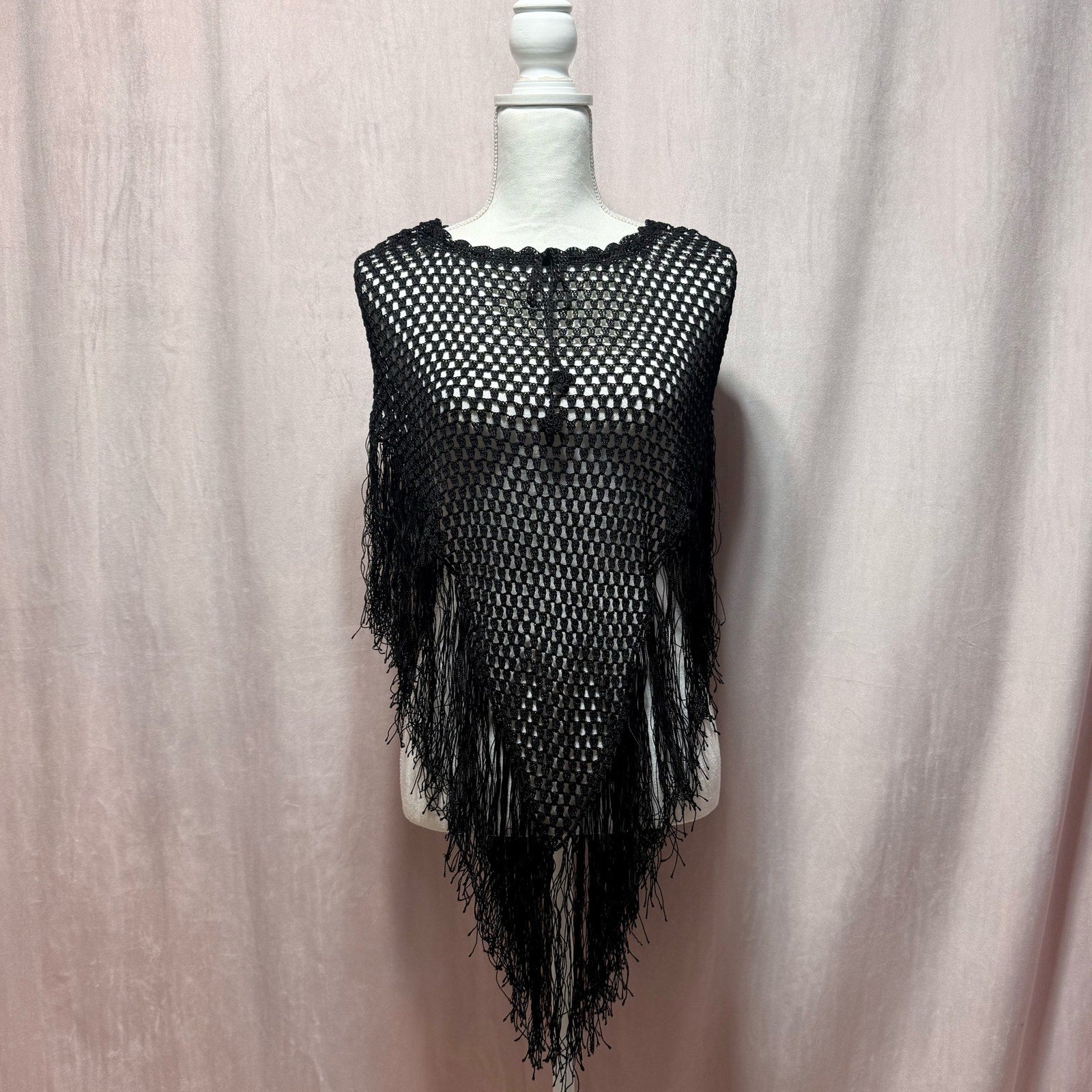 Secondhand Black Crochet Open Knit Fringe Hem Poncho