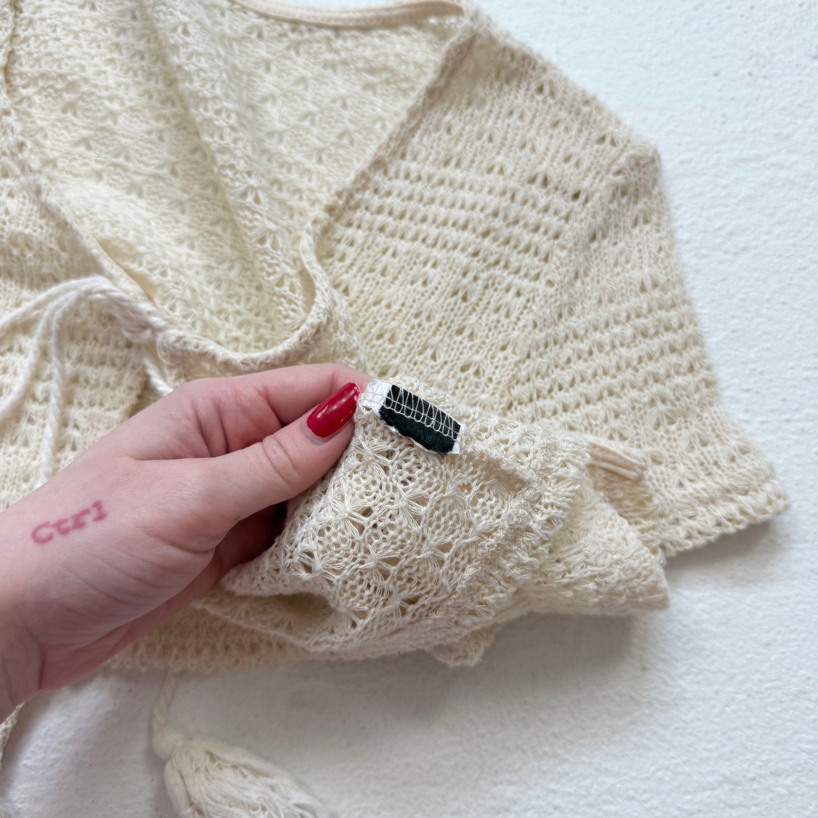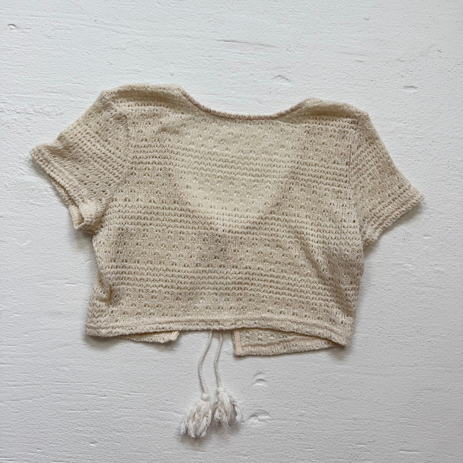 open crochet knit crop top in a soft cream tone with front tie closure and tassel detail. lightweight and semi-sheer with a flattering cropped fit — perfect layered over bralettes, tanks, or dresses for an effortless boho summer look. best fits size small based on measurements.