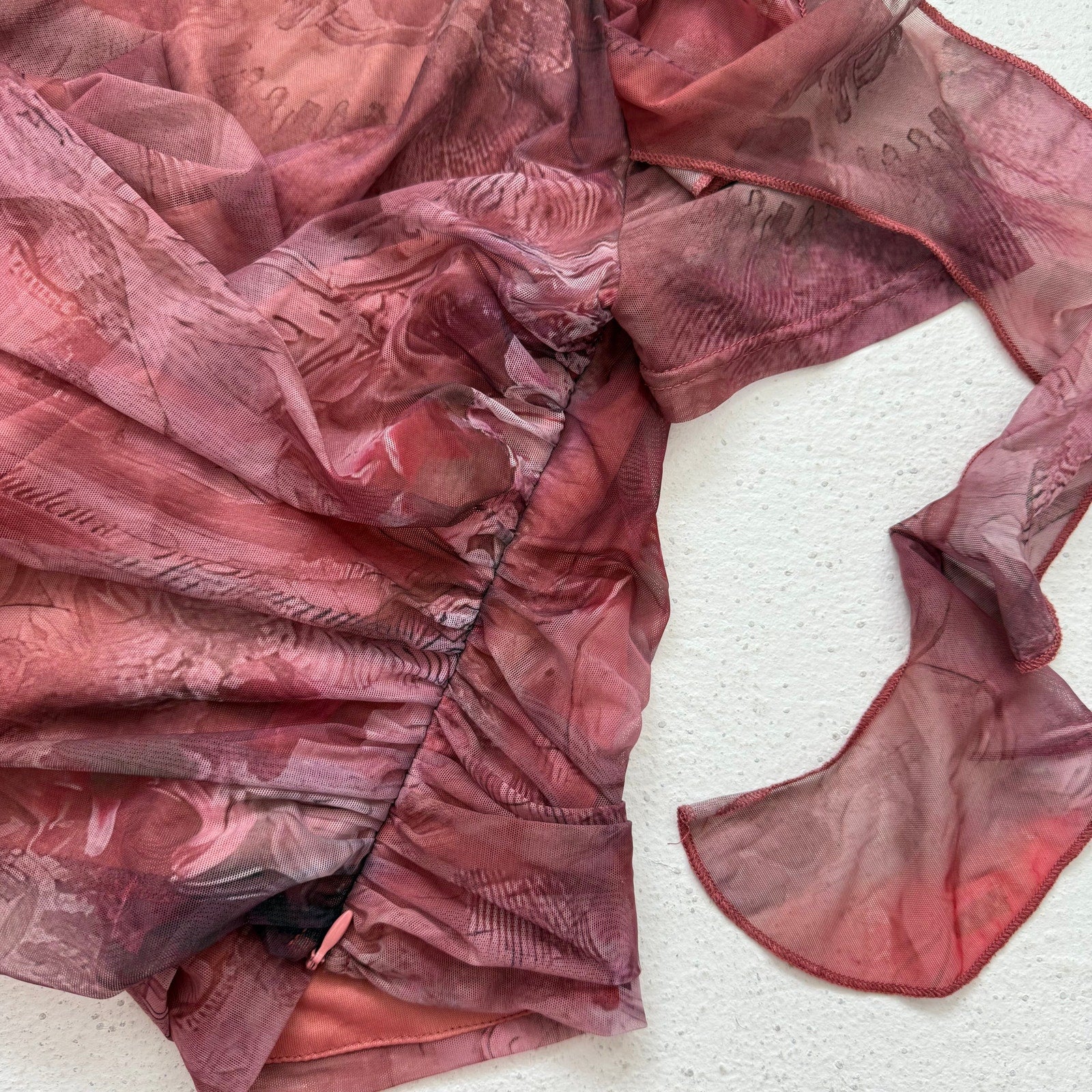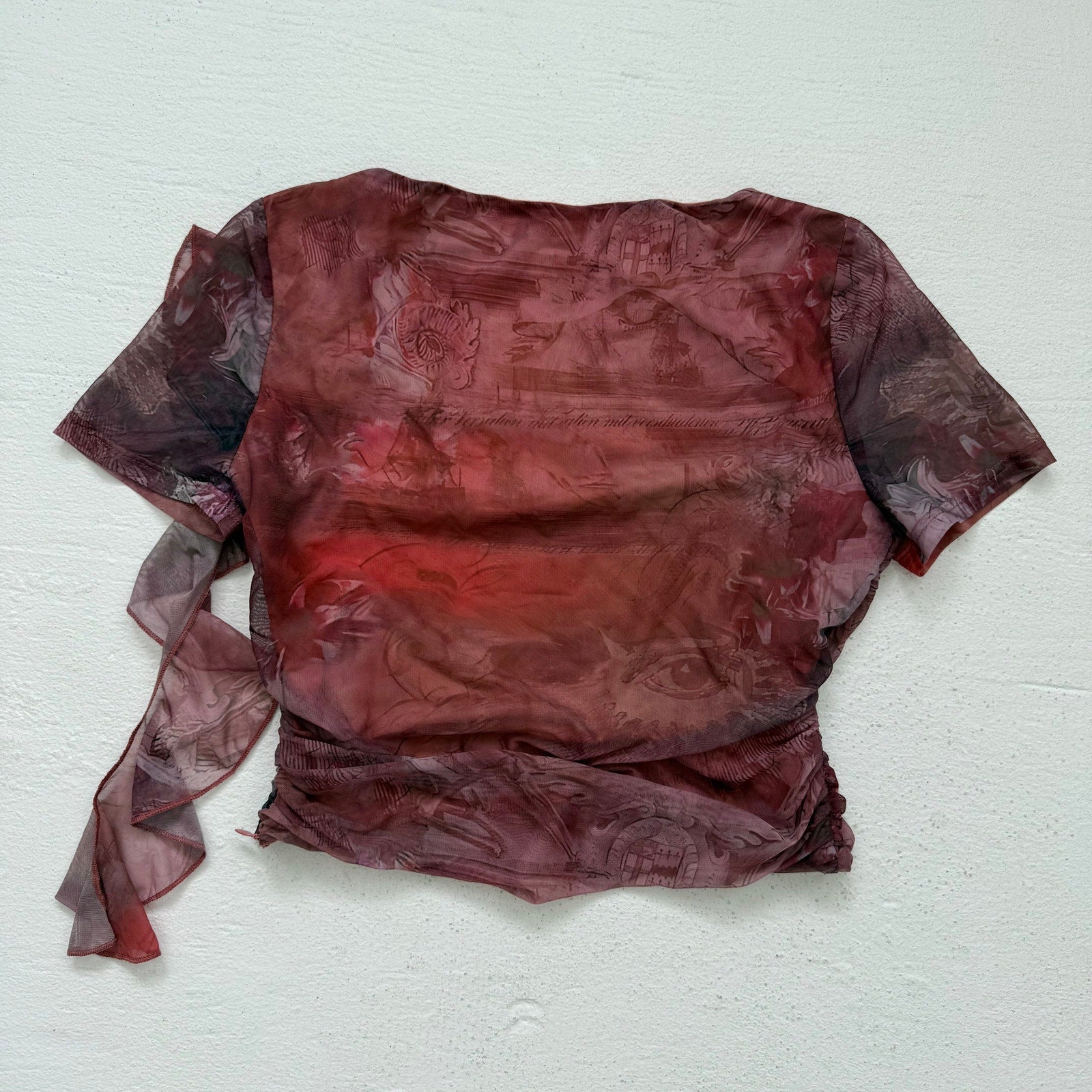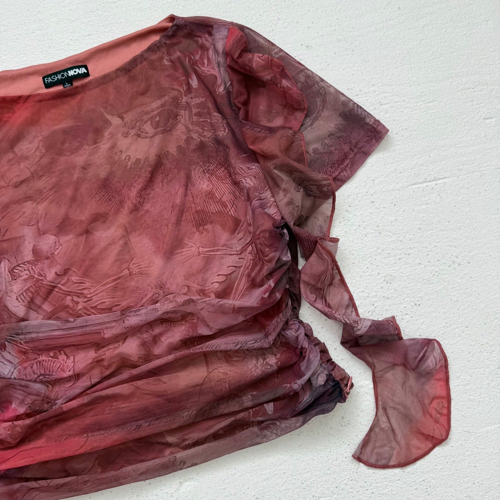 Elevate your wardrobe with this Fashion Nova New Love Mesh Crop Top in a captivating rust/combo colorway! This top features an abstract print, ruched detailing, and a fitted silhouette. Crafted from a micro mesh fabric and fully lined, it offers both style and comfort. The unique side front train adds a touch of drama, while the hidden side zip closure ensures a seamless fit.