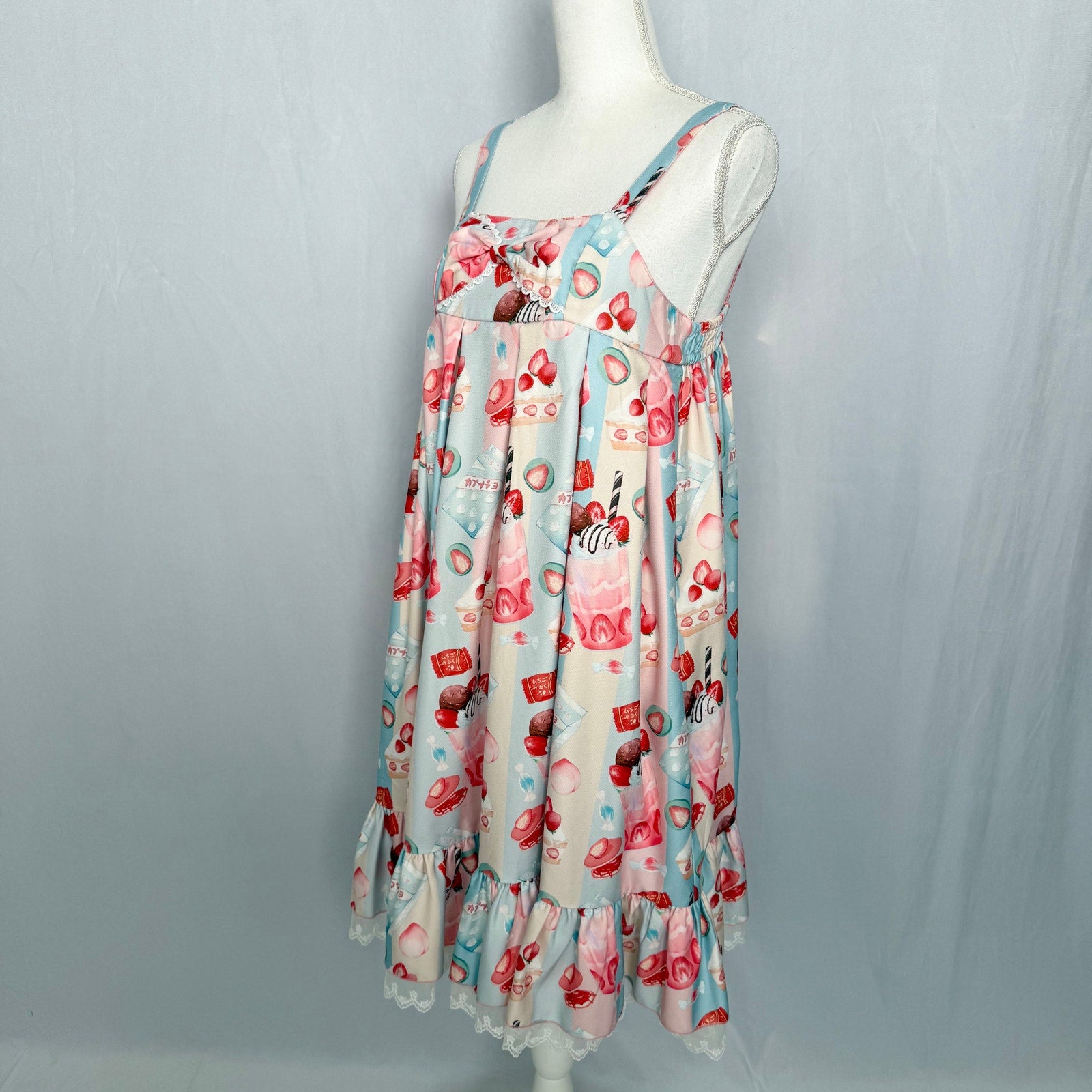 this infanta sweet lolita dress features a strawberry and dessert print with pink and blue pastel tones. designed with a babydoll silhouette, adjustable straps, and a lace trimmed ruffle hem, this knee length piece is perfect for kawaii fashion, jfashion, or sweet lolita styling.