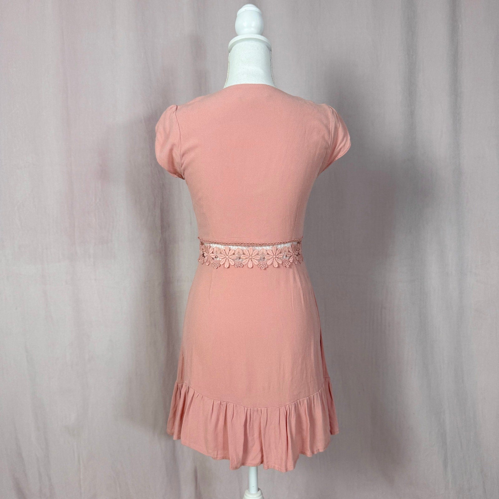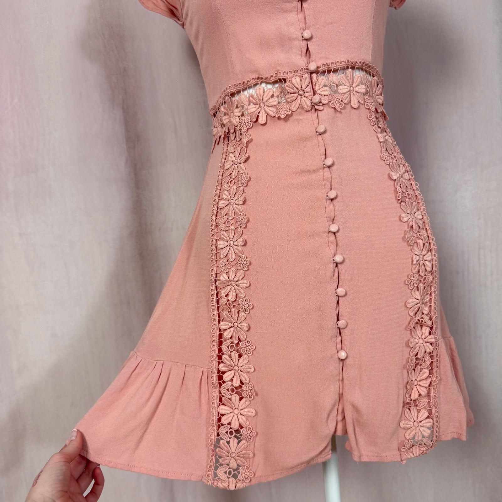 lulu's wistful wanderer dusty pink crochet lace dress. cap flowy sleeve lace trim fit & flare button up mini dress. lined