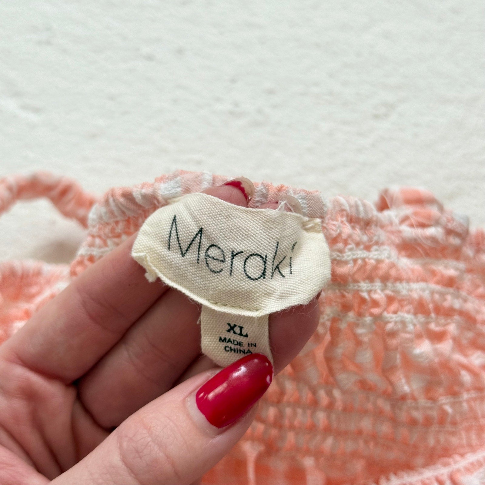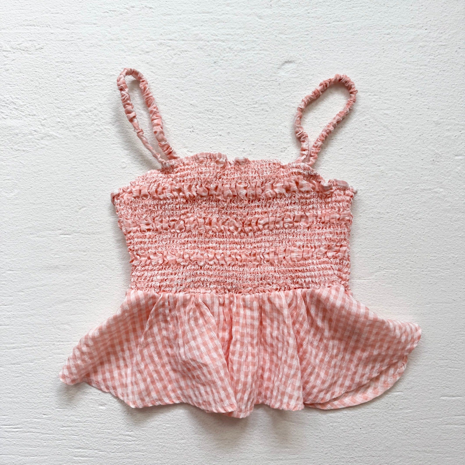 adorable peach and white gingham smocked crop top featuring stretchy ruched fabric with ruffle trim and peplum hem. soft, lightweight material with elastic straps for a comfy, flattering fit — perfect for spring and summer outfits, picnics, or layering with cardigans. marked youth XL, fits women's small