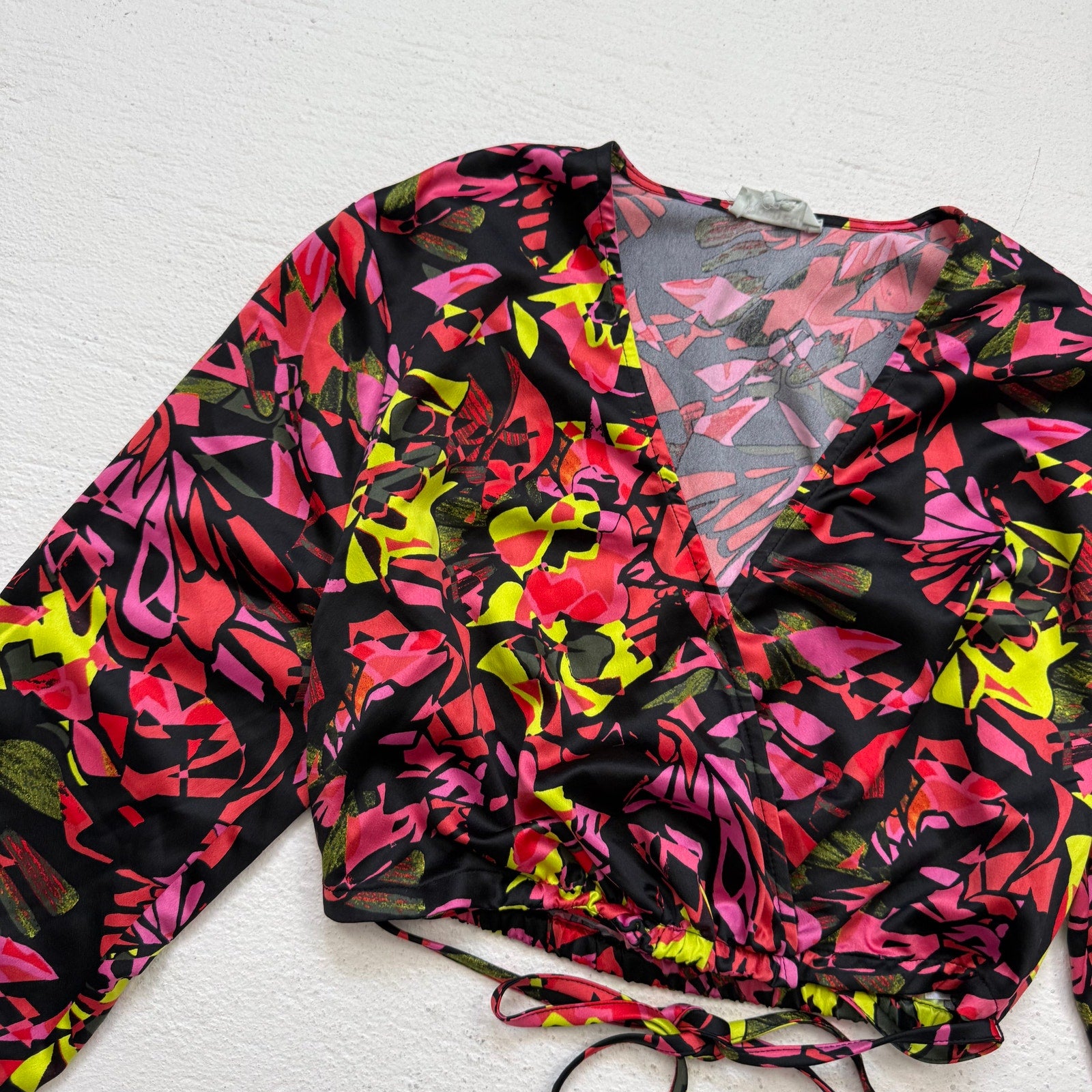 Bold satin floral wrap style crop top by Open Edit with V-neckline, long sleeves, and cropped fit. Features an elastic waist for comfort, back tie detail, and lightweight satin polyester in vibrant pink, red, yellow, and black abstract floral print. Perfect with high-waisted jeans, skirts, or trousers for day or night looks.