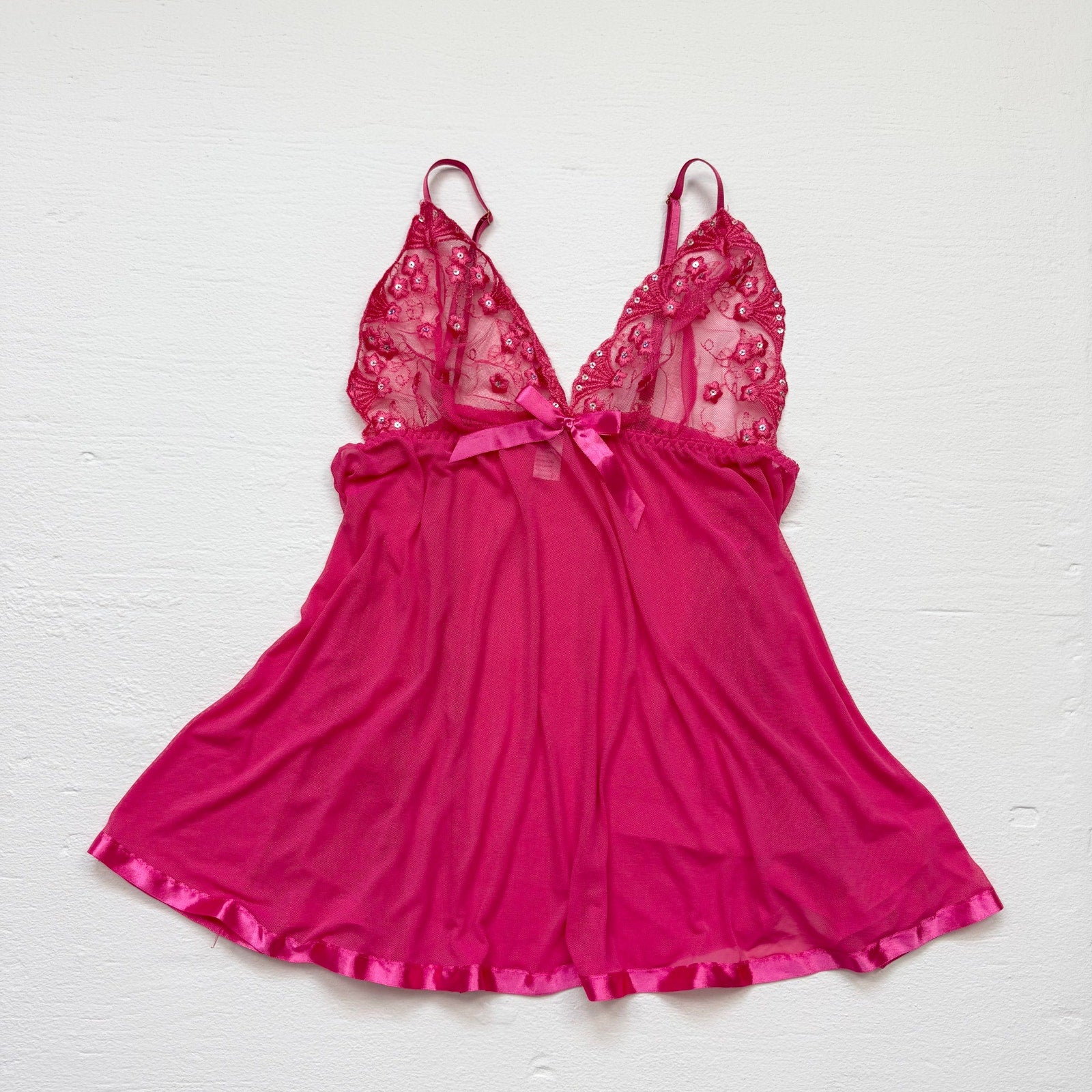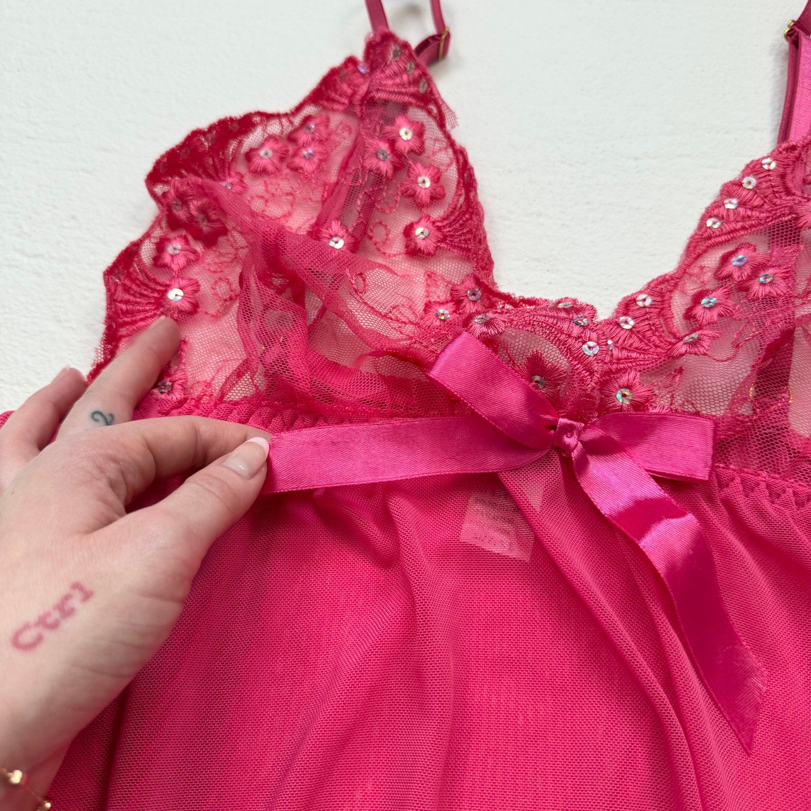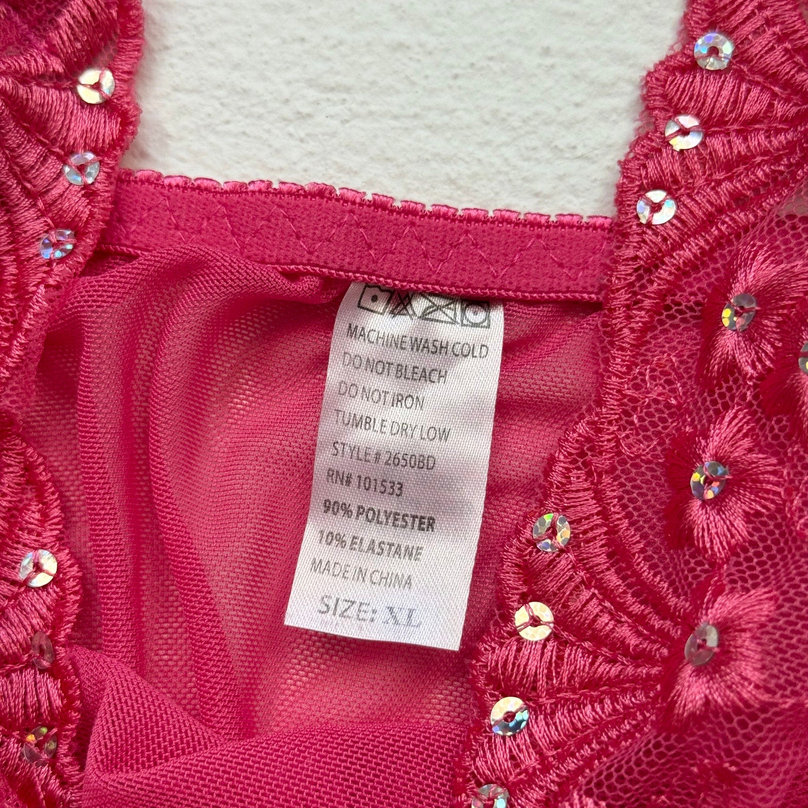 Secondhand Pink Mesh Sequin Lace Babydoll Lingerie Mini Nightgown, Size XL