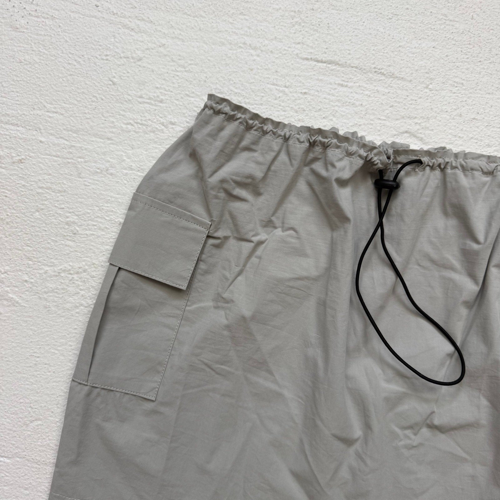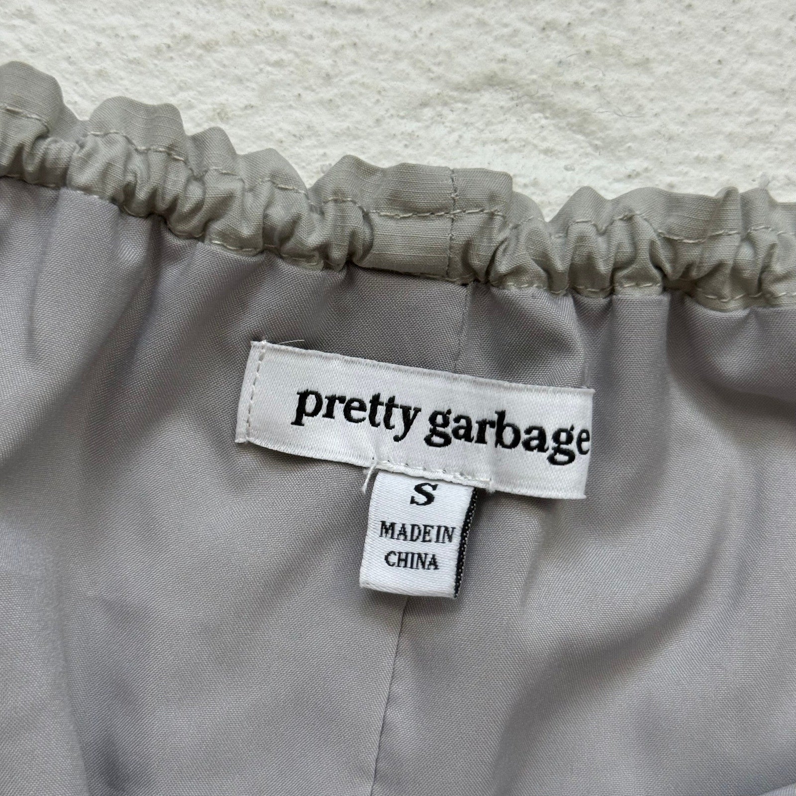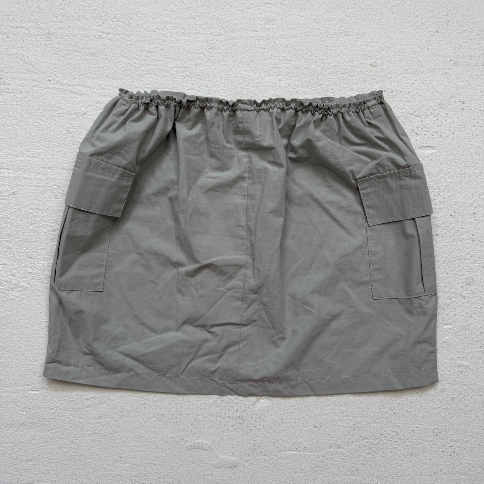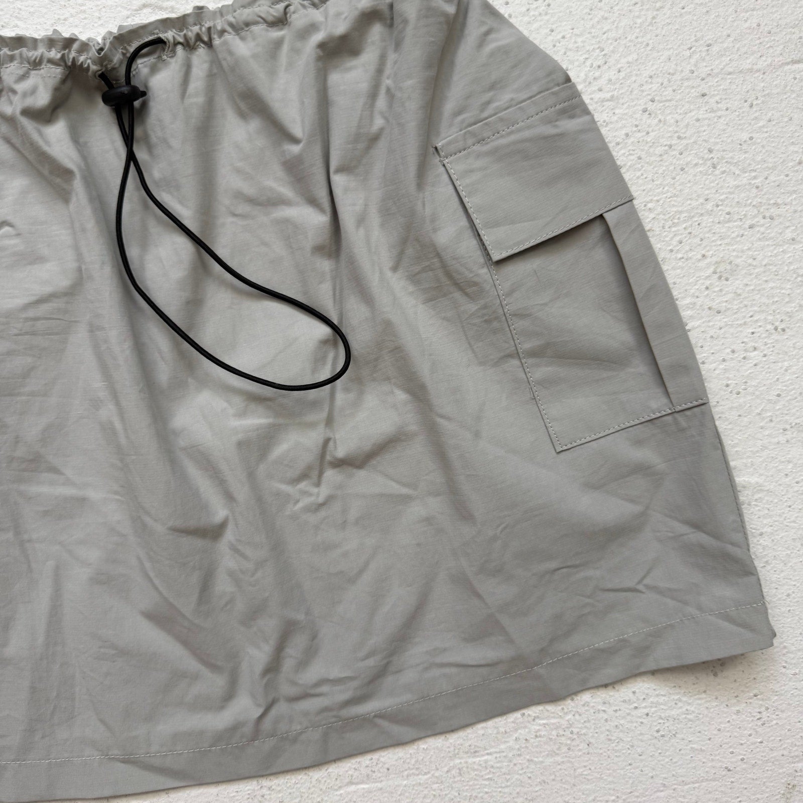Pretty Garbage cargo mini skirt in versatile gray. Adjustable elastic waistband with drawstring, two cargo flap pockets, and a lightweight cotton shell with soft stretch lining. Easy to style for casual or streetwear looks; mini length works with sneakers, boots, or sandals.