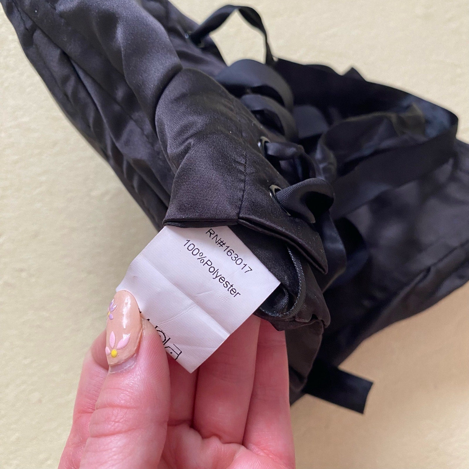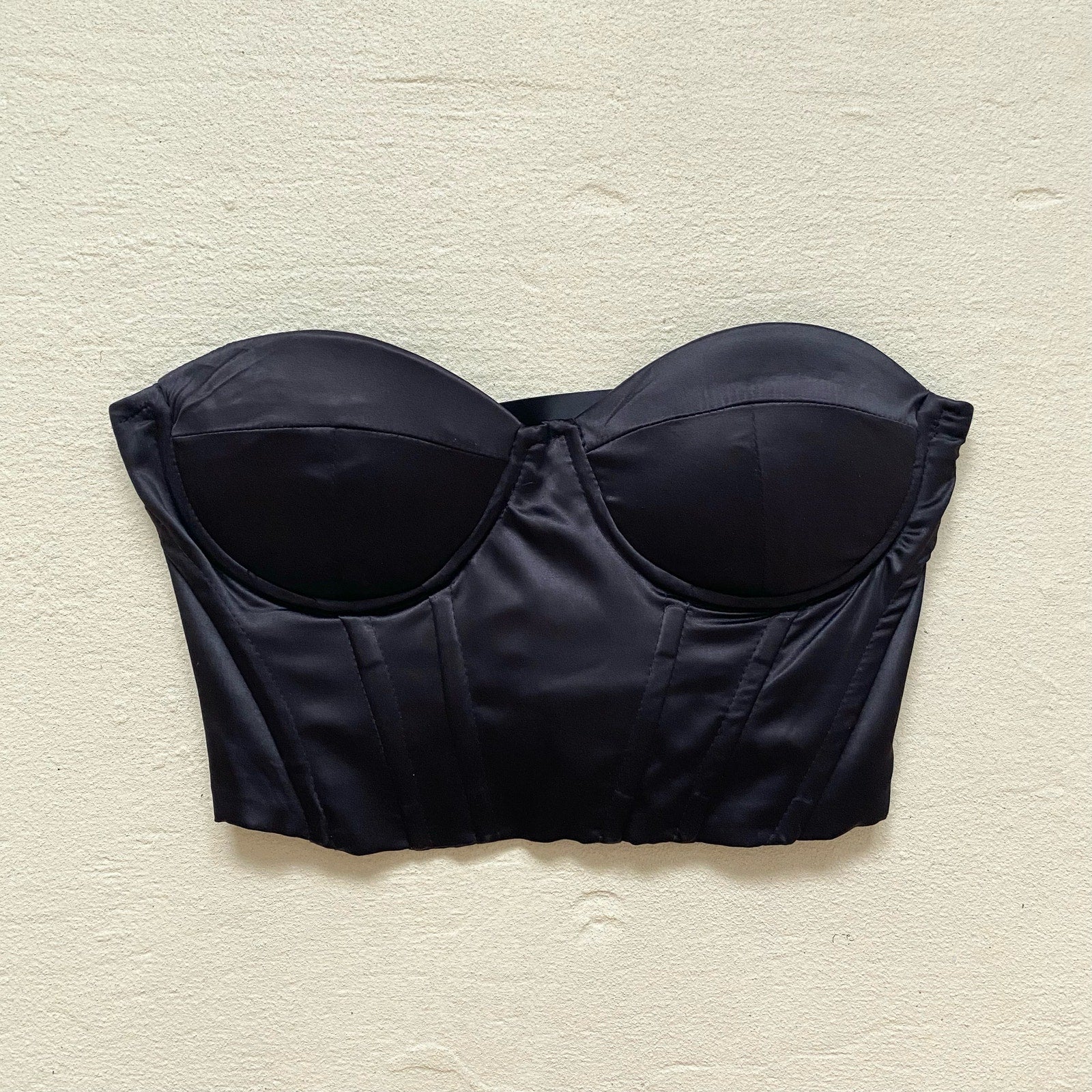 strapless black satin bustier corset with padding, boning & lace up ribbon back. lined