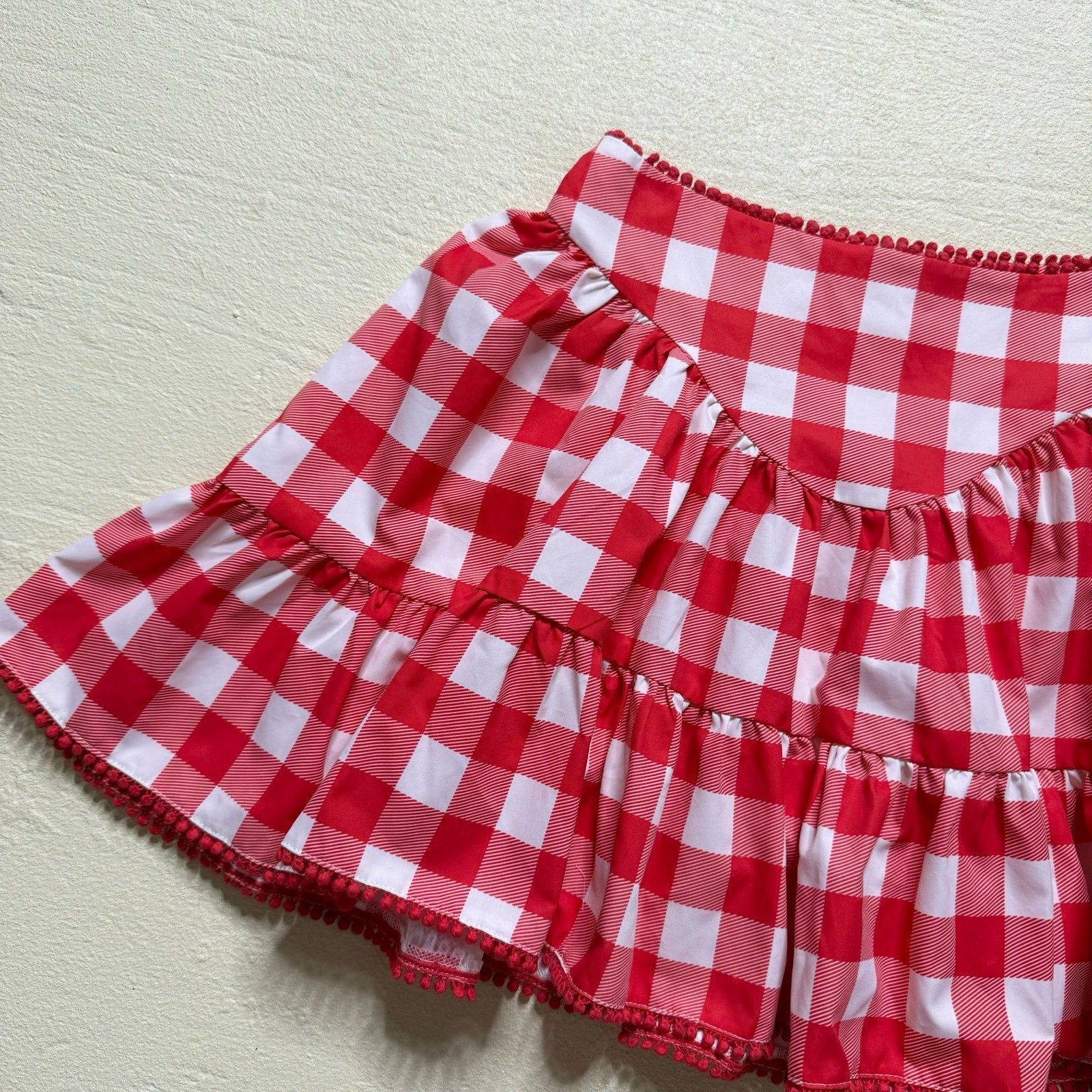 red white gingham A-line tiered ruffle mini skirt with mini pompom trim. hidden side zip closure. unlined