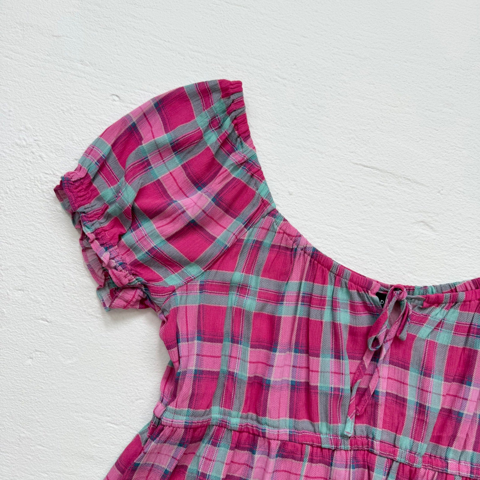 this NWT Torrid plaid top is a playful and flowy piece, featuring a pink and teal color palette with a flattering tie-front neckline and puff short sleeves. the lightweight fabric and babydoll silhouette make it perfect for casual wear, layering, or a summer festival outfit.
