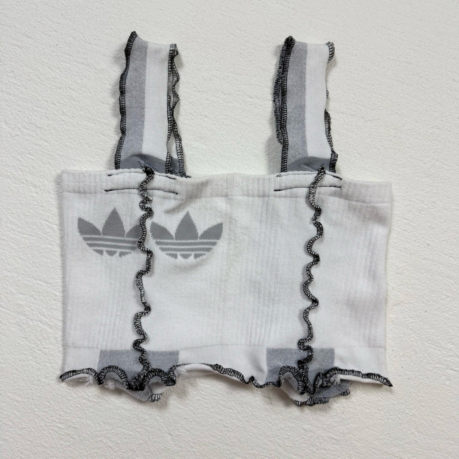 one of a kind reworked/upcycled adidas originals socks fitted crop tank top with outside seam detail. no marked size, fits XS-small best