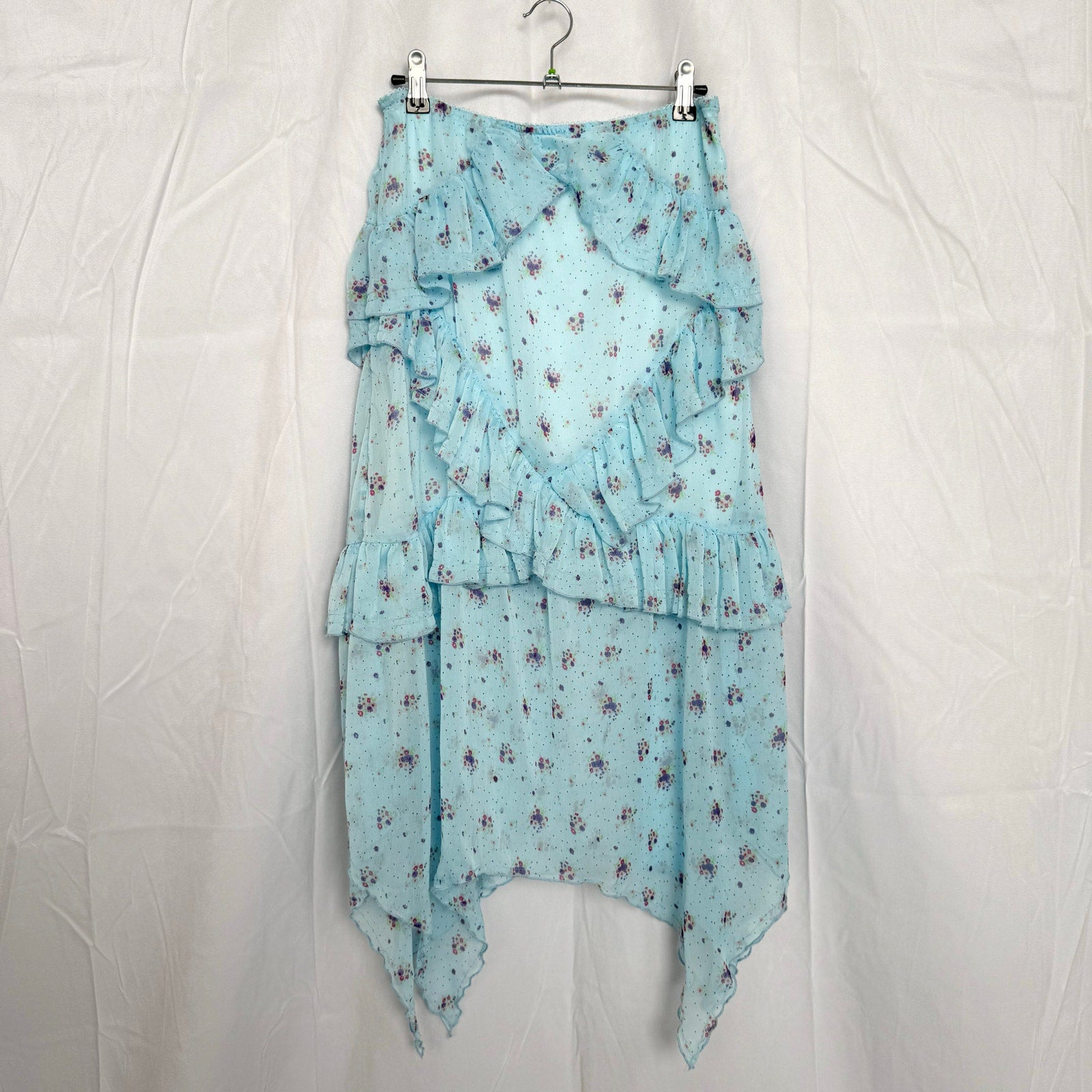 urban outfitters floral print light blue chiffon ruffle asymmetrical handkerchief flowy midi skirt with mini skirt lining. hidden side zip closure. no marked size, fits size medium - please see measurements!