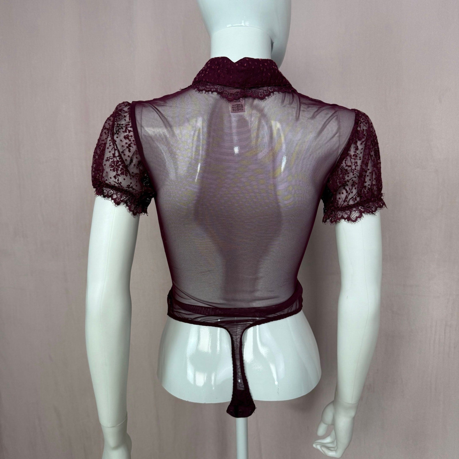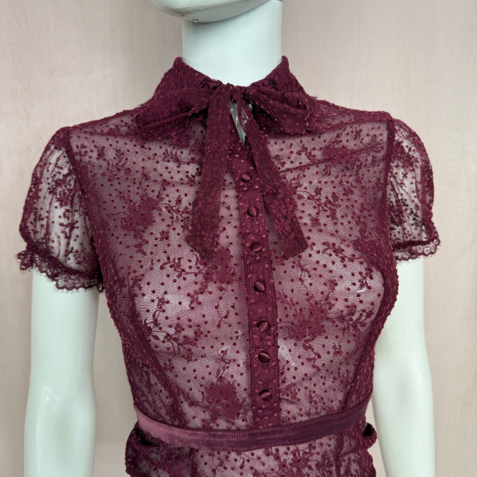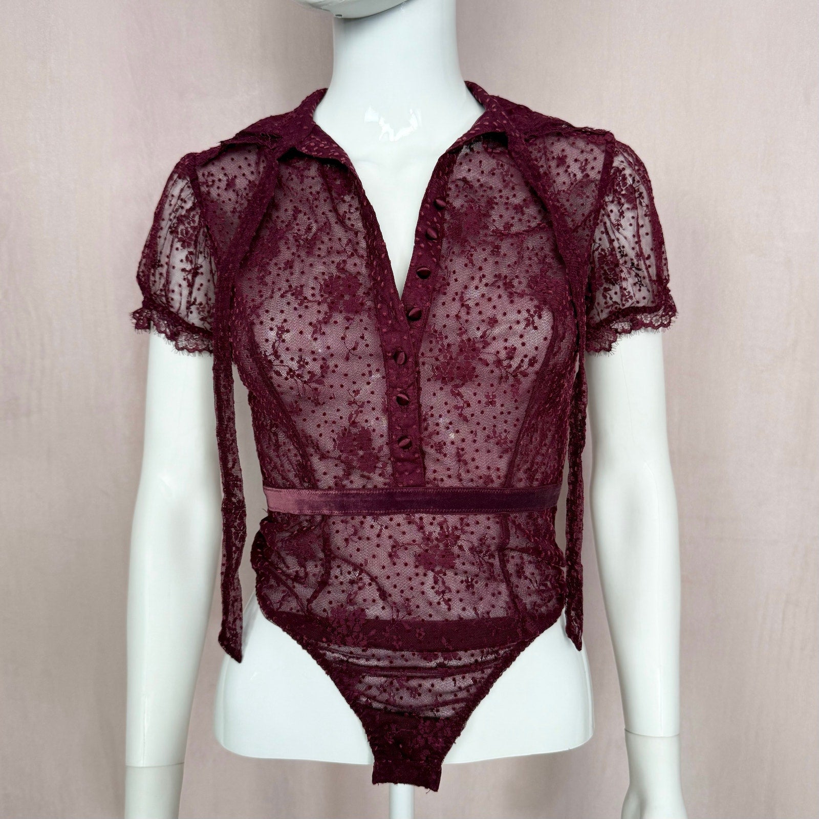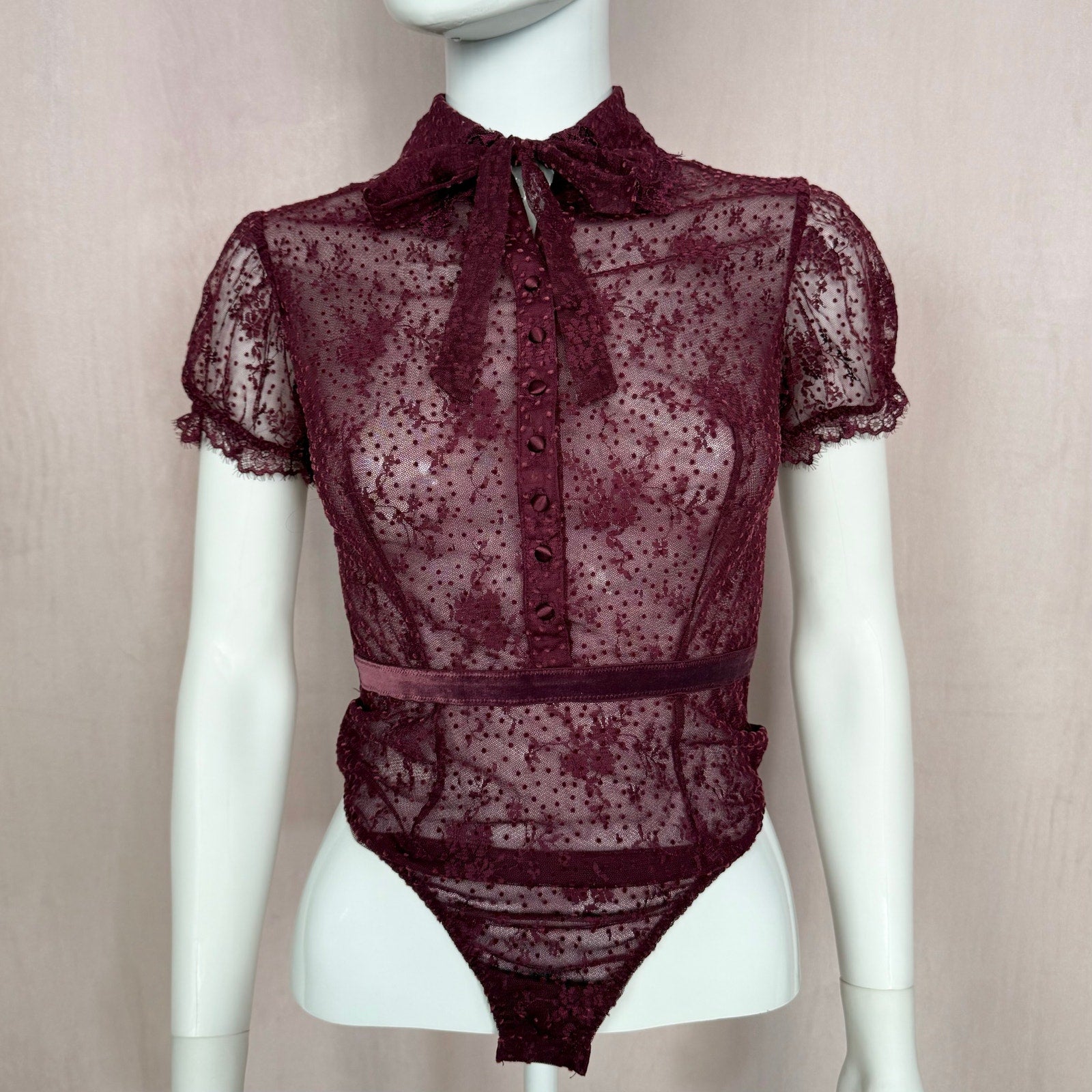 VS burgundy see through mesh lace floral polka dot button up collared tie front puff sleeve bodysuit with velvet polka dot stripe detail. lace trim. stretchy fitted. snap bottom