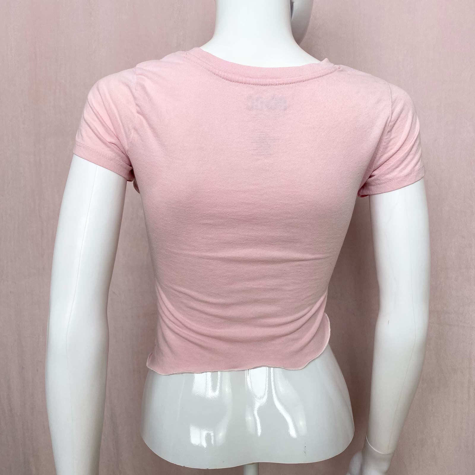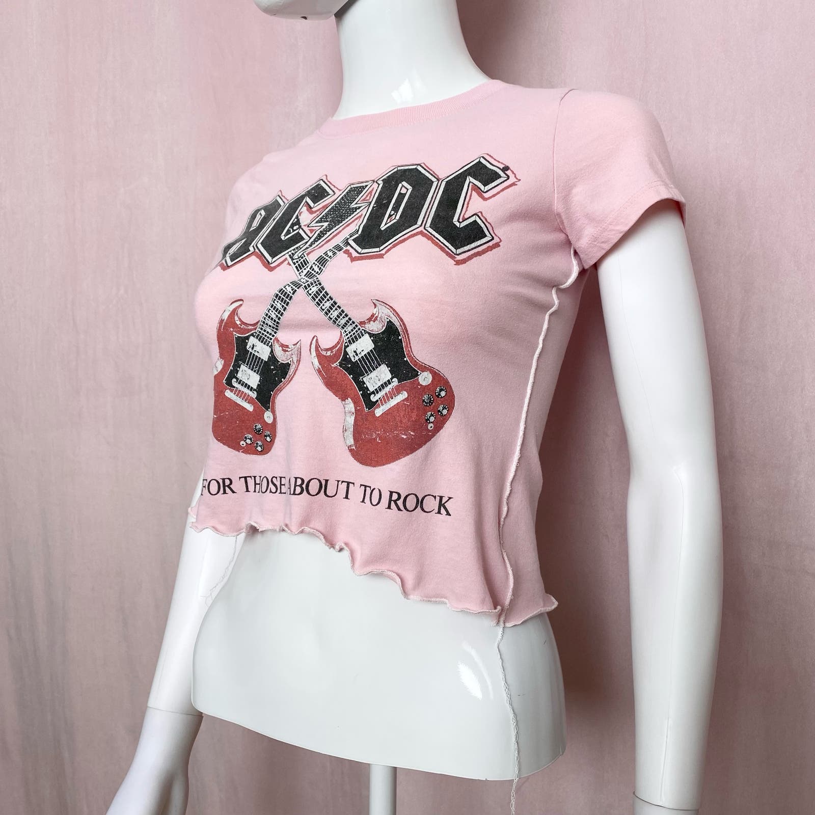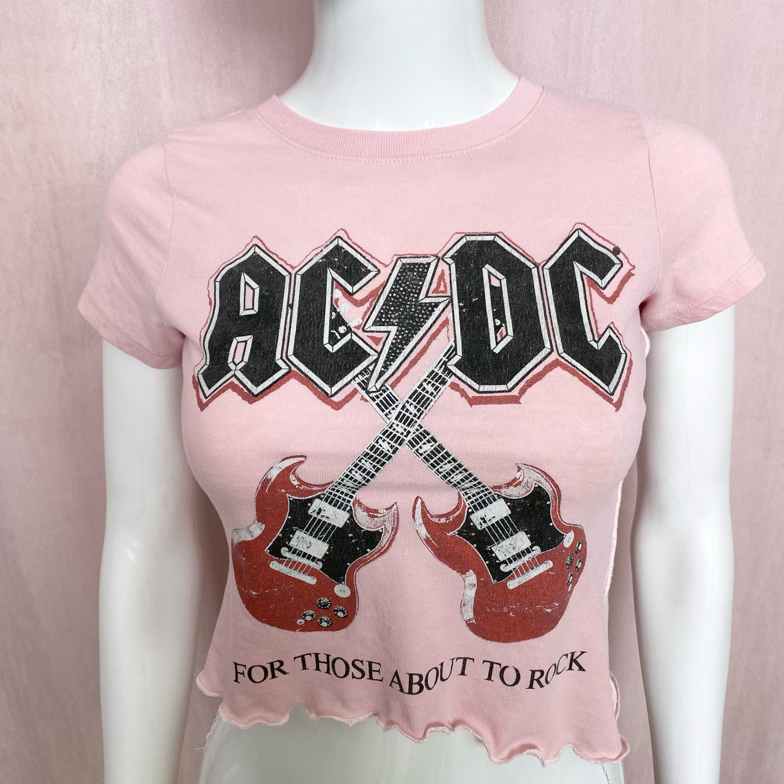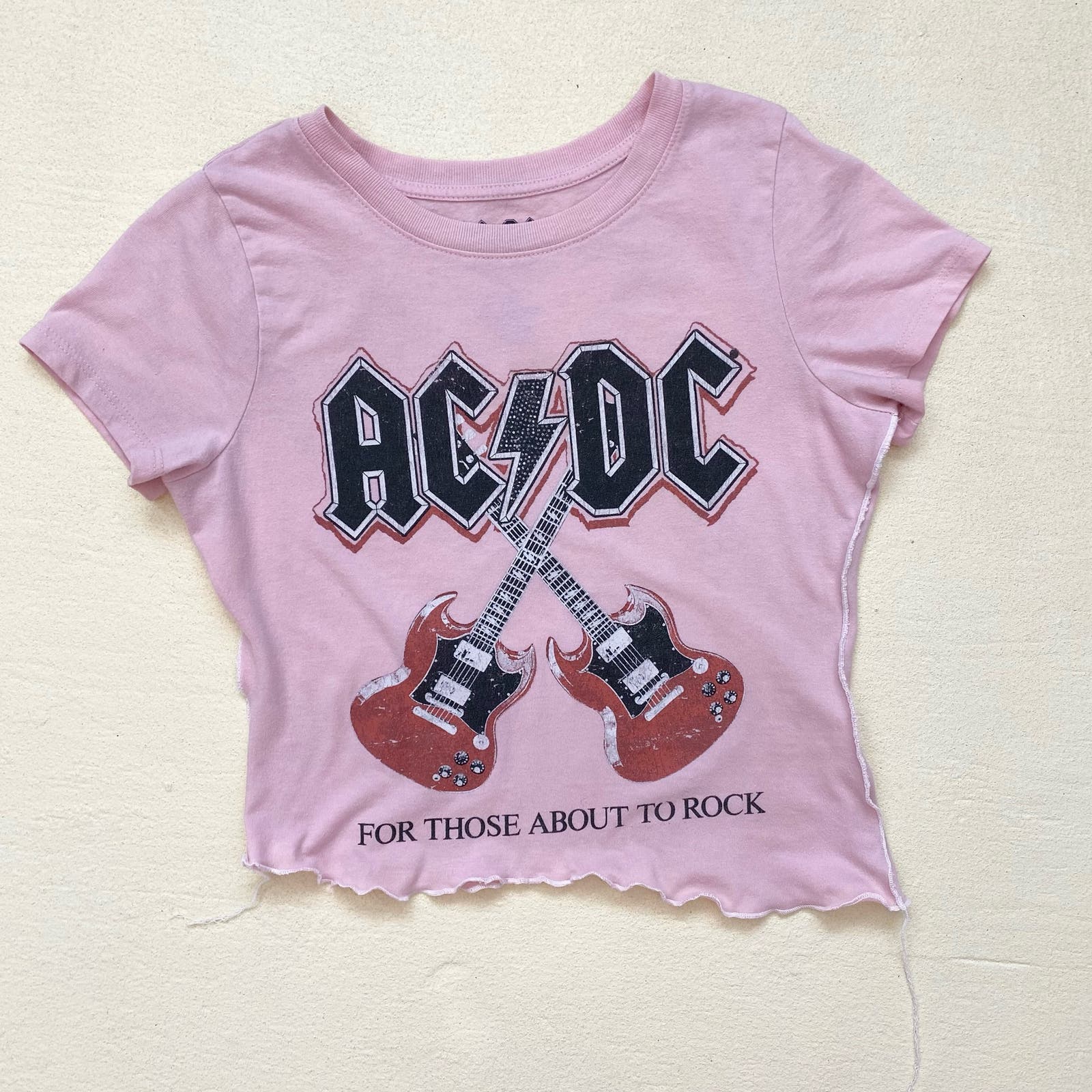 reworked ACDC “For Those About To Rock” electric guitar graphic print pink short sleeve cropped fitted t-shirt with asymmetrical lettuce hem & outside seem dangly over stitch detail. thin lightweight soft stretchy cotton blend fabric. marked youth large, fits women’s small best