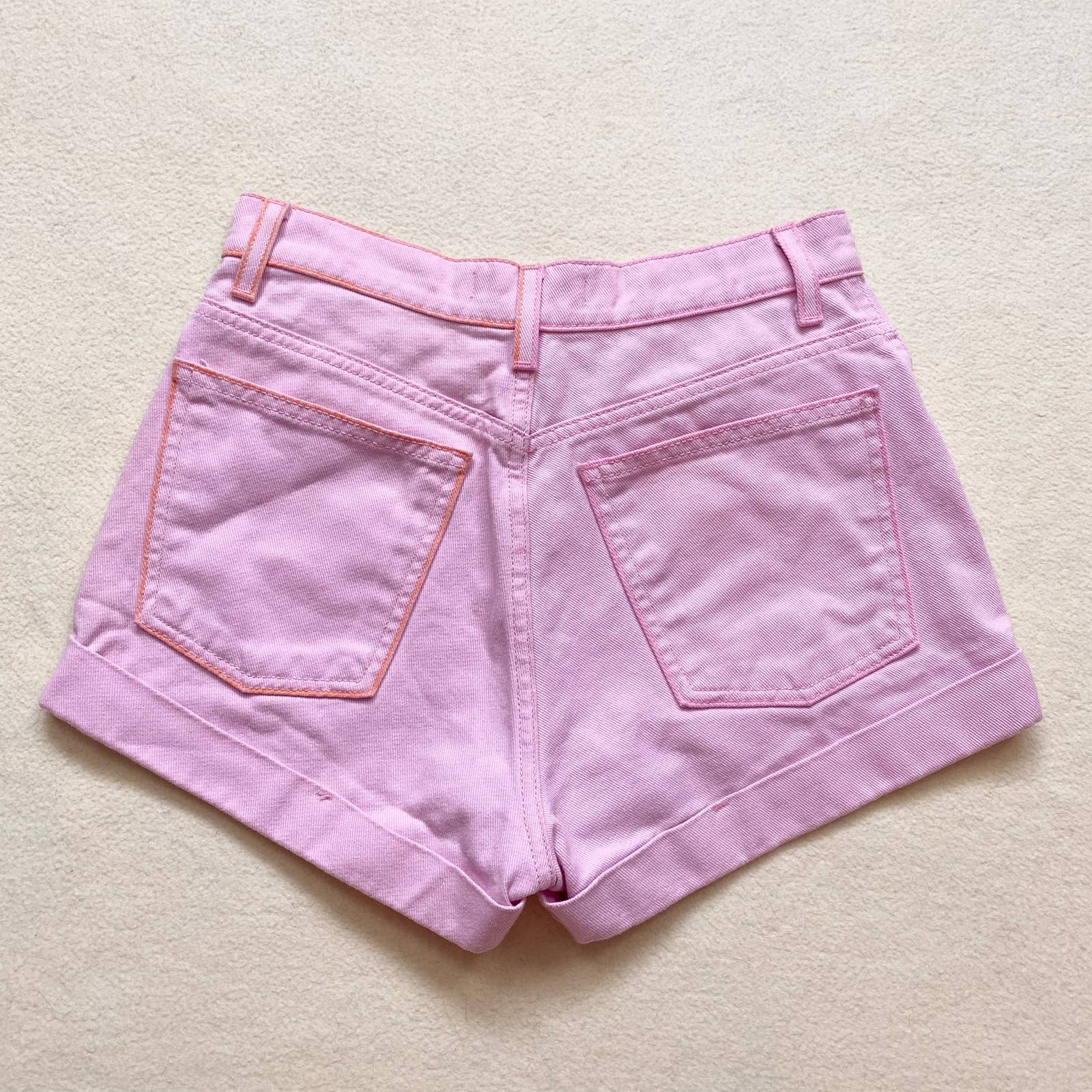 high waisted candy pink cuffed jean shorts with flower design drawn on with fabric marker. front & back open pockets. front zip top button closure. belt loops. made in USA