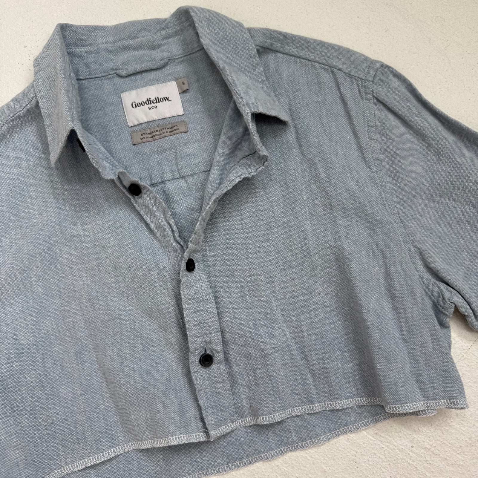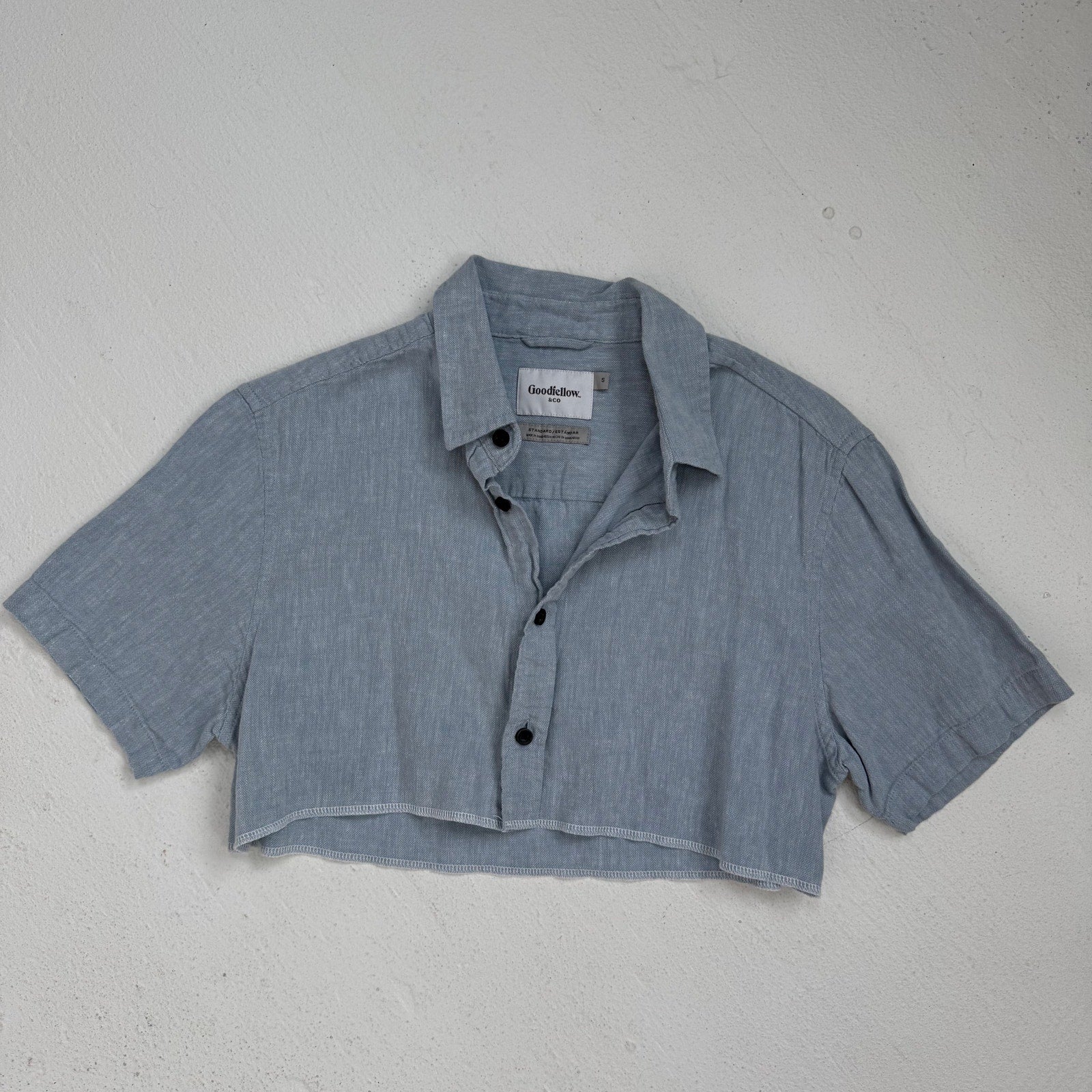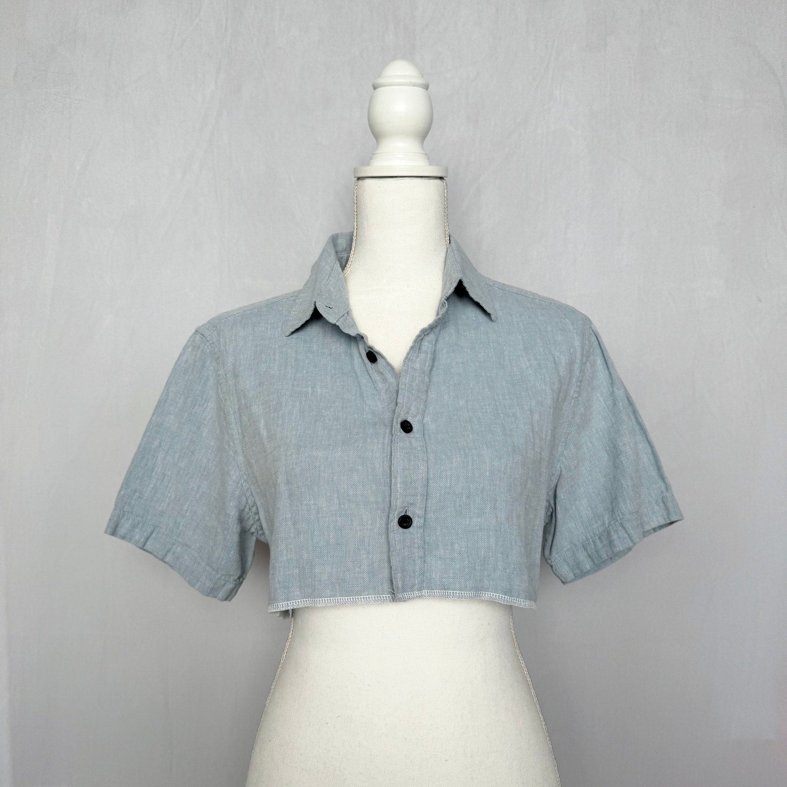 Lightweight, breathable cropped button-up in a versatile light blue. Short sleeves, black button front, and soft linen-cotton texture—easy for warm weather or layering. Originally a men’s small, reworked into a cropped style that fits oversized women’s small.