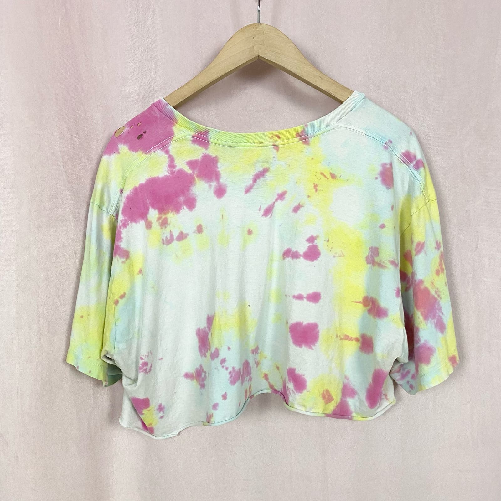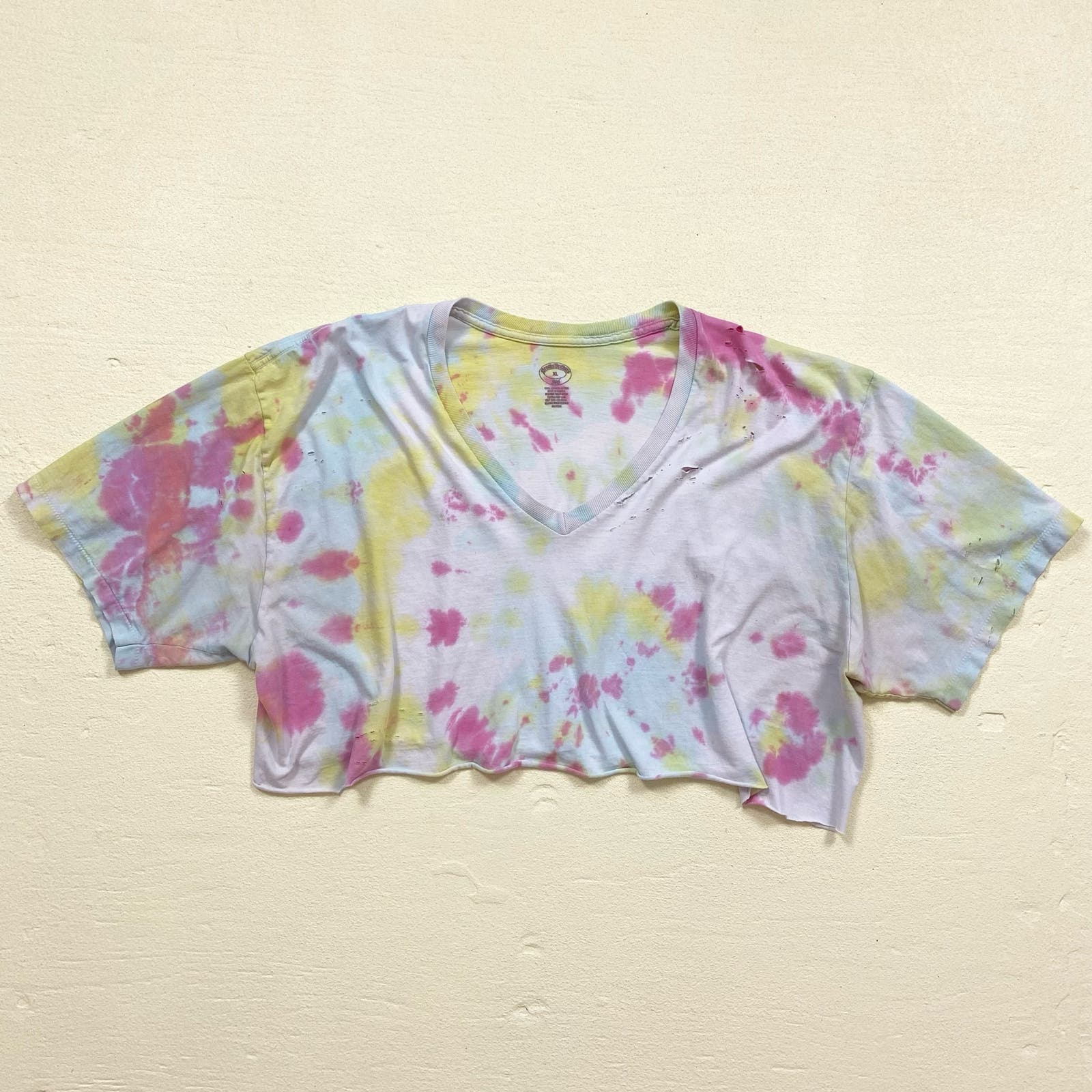 reworked Brooks Brothers cropped v-neck short sleeve tie dyed destroyed ripped faded t-shirt. thin flowy lightweight soft stretchy fabric. marked men's size XL, fits oversized women's