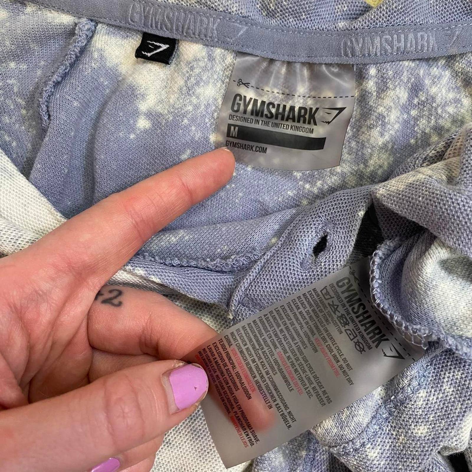 gymshark fitness 1/4 button front acid washed bleached purple cropped long sleeve top with thumb holes & distressed style graphic brand logo back. scoop neck. 100% cotton