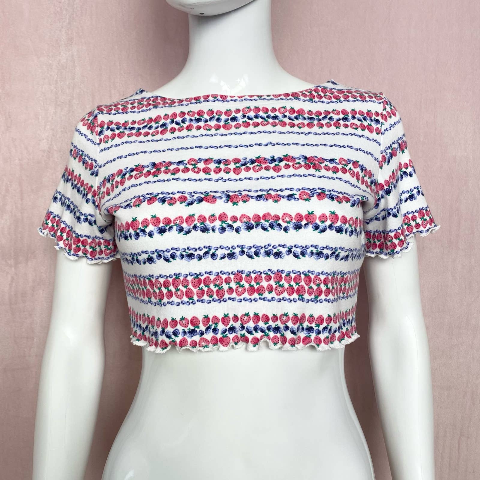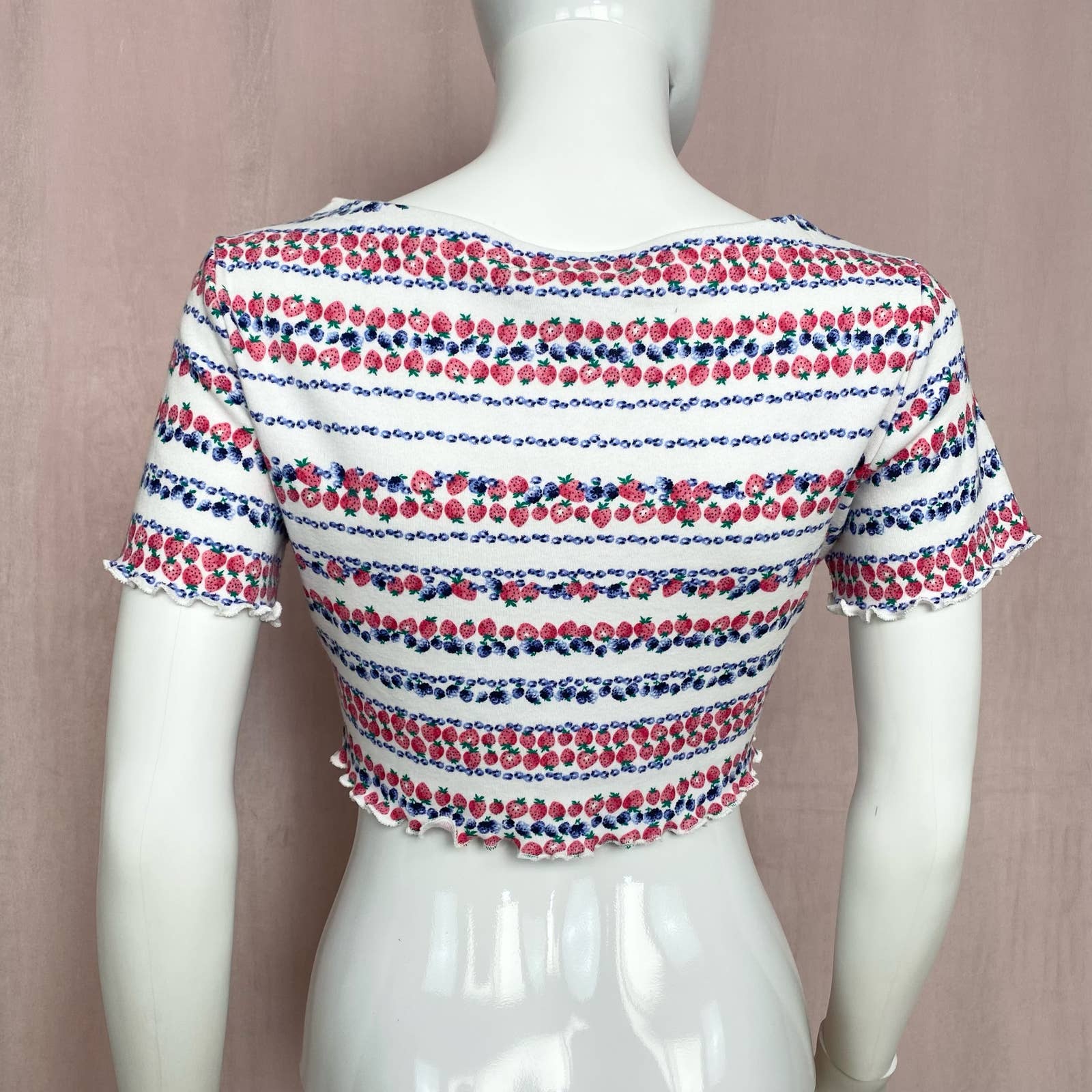 short sleeve knit cropped t-shirt top with strawberry blueberry stripe print & lettuce hem sleeve & bottom hem. very soft stretchy fabric. marked size merits small, fits best small-medium
