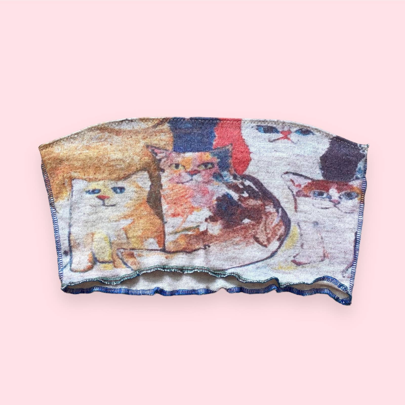 sweater knit strapless cropped tube top inside out style with side seams on outside of piece & bottom lettuce hem. multicolor kitty print. made fully from secondhand scrap fabric. fits small-medium but please check measurements for best fit!